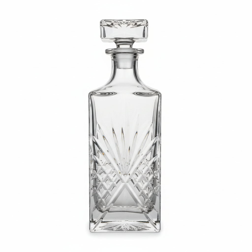 Kjo shishe elegante prej qelqi transparent me formë katrorë është ideale për servirjen e uiskit ose pijeve të tjera alkoolike, duke i dhënë një pamje të sofistikuar çdo tavoline apo minibari. Dizajni dekorativ me model qelqi të prerë krijon reflektime të veçanta drite dhe nxjerr në pah ngjyrën e pijes. Tapëja e përputhur prej qelqi mbyll mirë shishen, ndërsa baza e saj e trashë dhe e rëndë siguron stabilitet gjatë përdorimit.