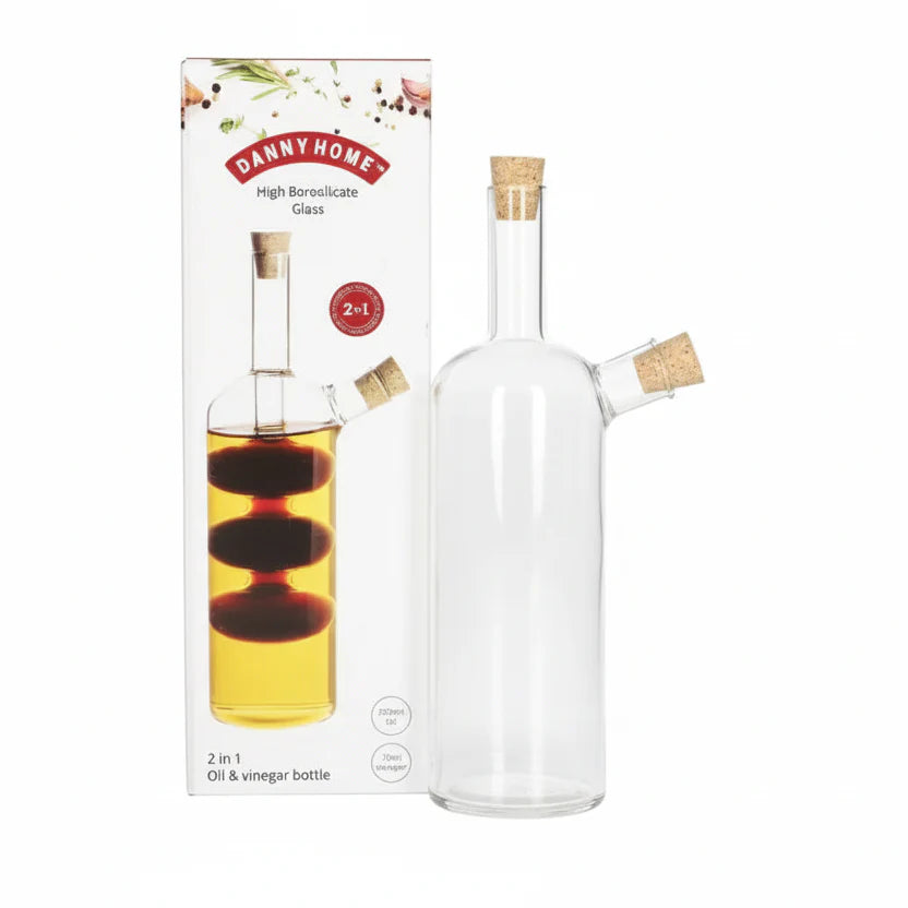 Shishe qelqi me dy ndarje, ideal për ruajtjen dhe servirjen e vajit dhe uthullës në një enë të vetme.