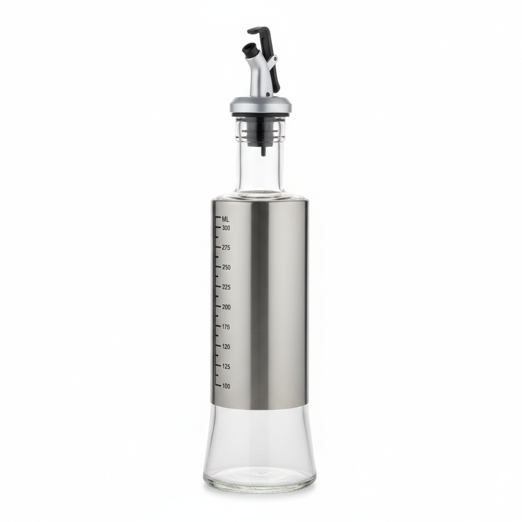 Kjo shishe praktike e vajit ka trup transparent me mbështjellës metalik dhe shënime vëllimi deri në 300 ml, për matje të lehtë dhe të sakta në gatim të përditshëm. Gryka me kapak mundëson derdhje më të kontrolluar dhe ndihmon në reduktimin e pikimit mbi tavolinë apo sobë.