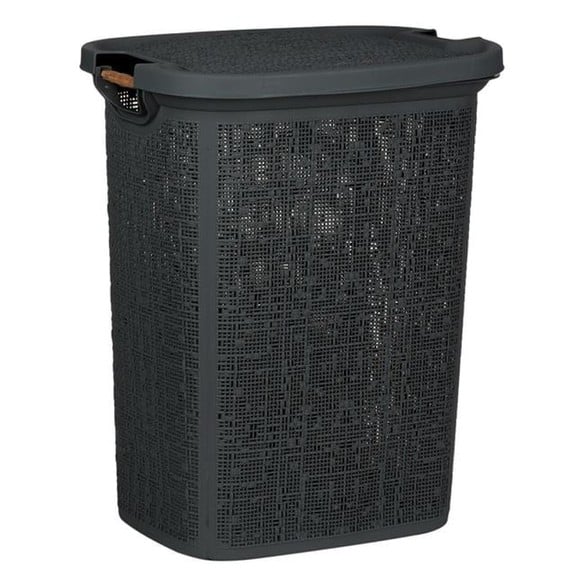 Shportë rrobash për banjo me ngjyrë qymyri me dizajn të shpuar dhe doreza druri. Kapaku mund të shkëputet. Ideale për organizimin dhe rregullimin e banjës. Gjatësia x Gjerësia x Lartësia 46x37x57.5cm