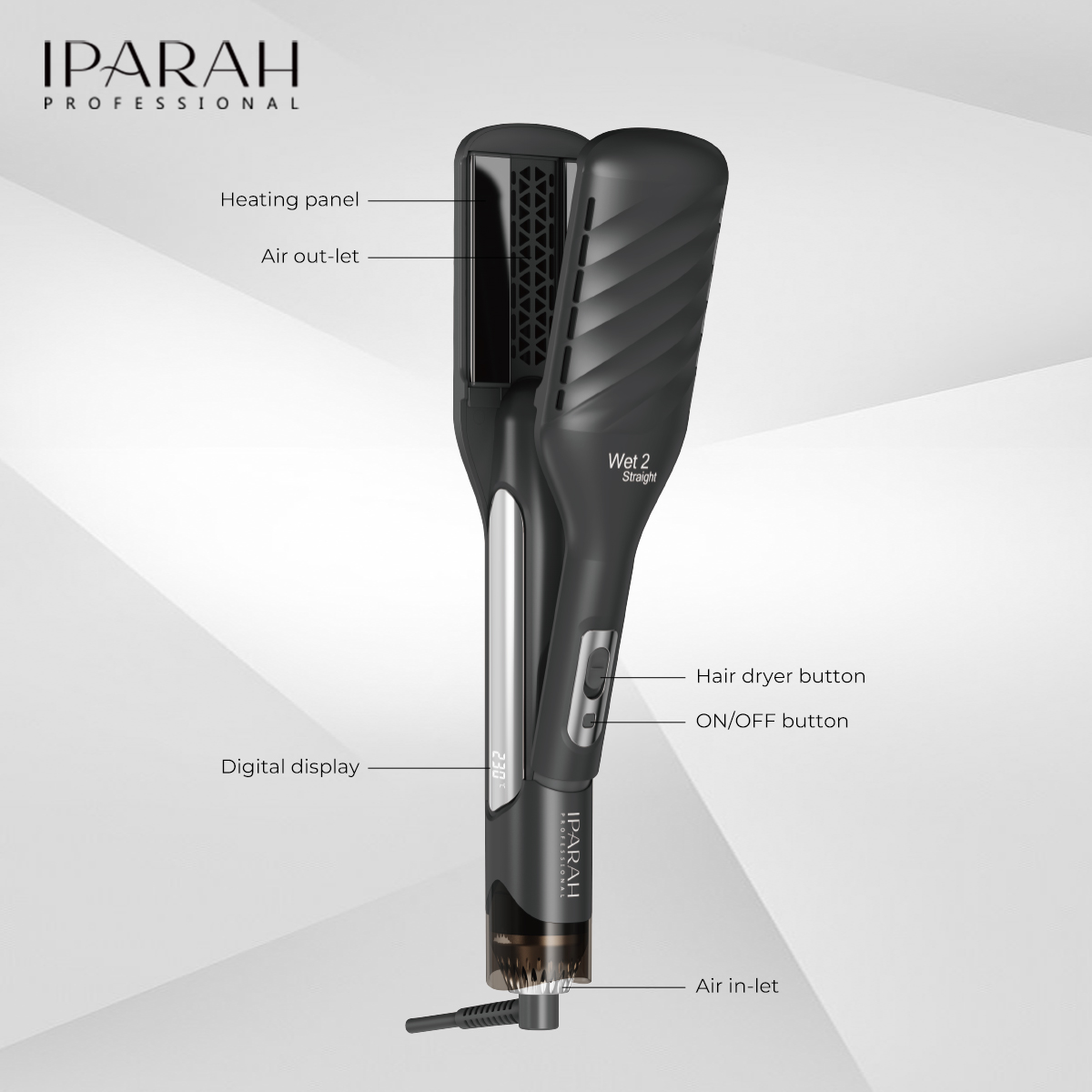 IPARAH P-100 është një pajisje profesionale 2-në-1 Duet Style, që kombinon funksionin e tharëses së flokëve dhe pjastrës për drejtim, duke ofruar stilim të avancuar me ajër të nxehtë në një pajisje të vetme. E pajisur me motor BLDC me mbi 60.000 RPM, kjo pajisje siguron rrjedhje ajri të fuqishme, tharje të shpejtë dhe performancë të qëndrueshme si për sallone bukurie ashtu edhe për përdorim shtëpiak.
