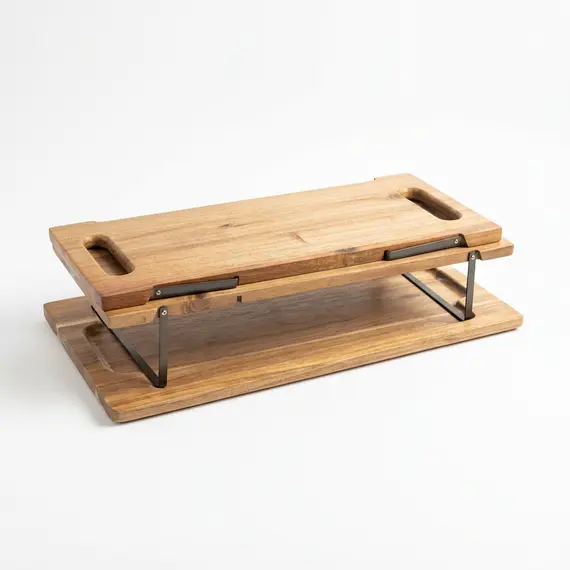 Kjo tabaka rektangulare prej druri me përfundim të lëmuar kombinon stilin natyral me funksionalitet modern për servirjen e ushqimeve dhe pijeve. Dorezat metalike të zeza sigurojnë kapje të qëndrueshme, ndërsa baza e ngritur me këmbë metalike e kthen në një platformë elegante servirjeje në tryezë apo banak.