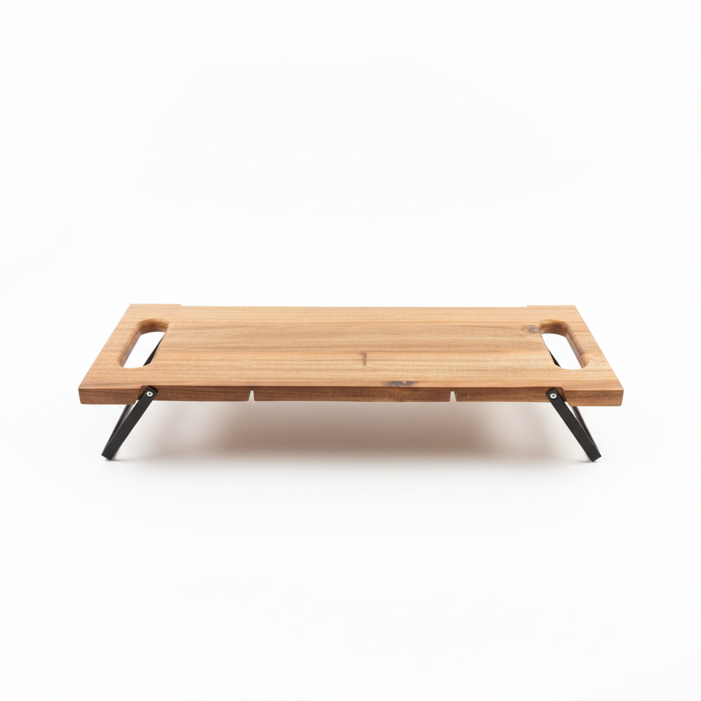 Tabakë servirjeje prej druri me formë drejtkëndore, e pajisur me doreza anësore dhe këmbë metalike palosëse për përdorim të lehtë dhe të lëvizshëm.