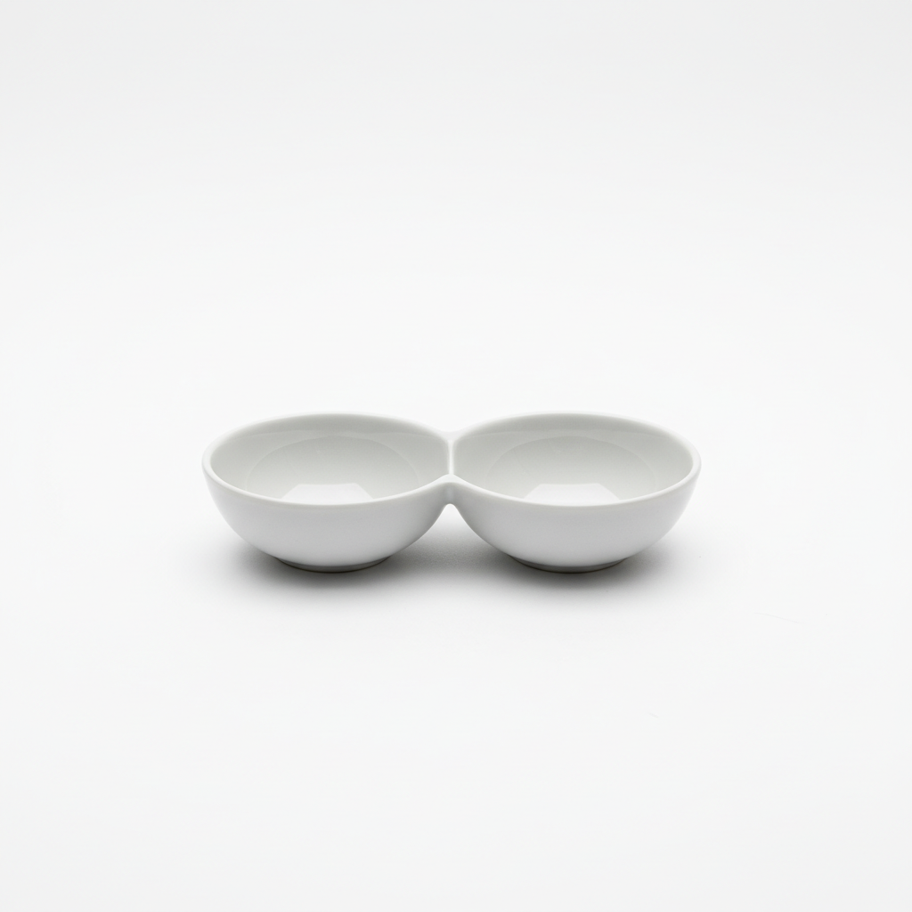 Enë kompakte qeramike me dy ndarje të ndara, ideale për servirjen e salcave, soseve dhe ushqimeve të vogla shoqëruese në tryezë. Dizajni elegant me përfundim me shkëlqim dhe ngjyrë neutrale e bën të lehtë kombinimin me çdo shërbim tavoline.