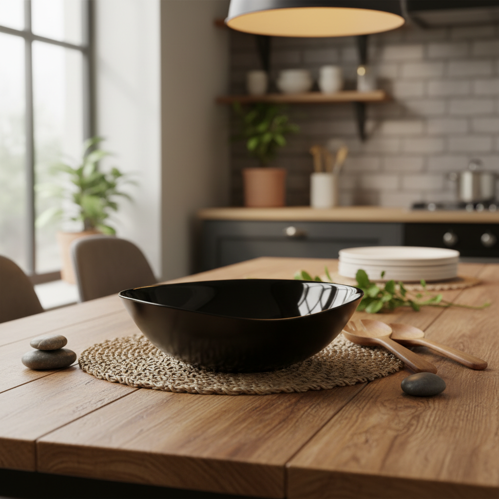 Tasi i zi i thellë ofron një zgjidhje praktike dhe elegante për servirjen e sallatave dhe gatimeve të ndryshme në tryezën tuaj. I prodhuar në P.R.C., ai kombinon dizajnin modern me funksionalitetin shumëpërdorimësh.