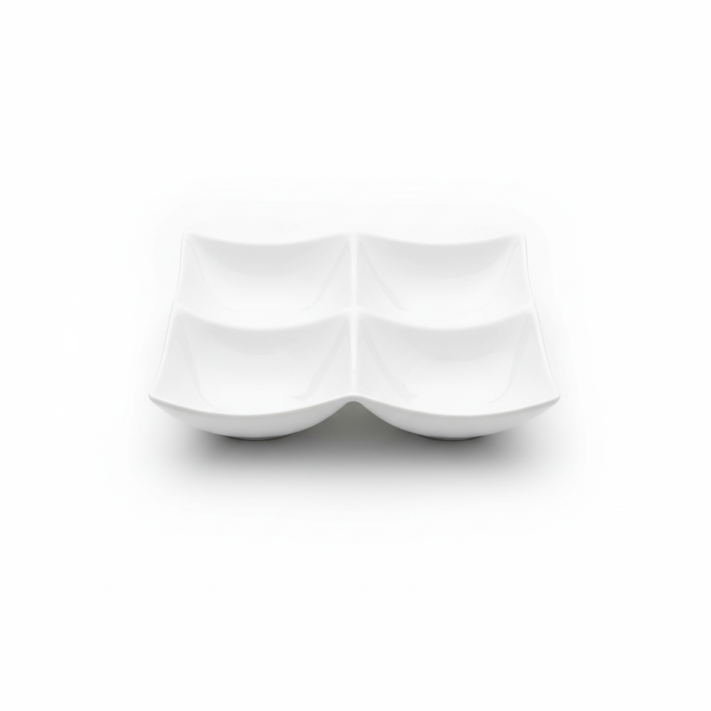 Tasi qeramik i bardhë me 4 ndarje është ideal për servirjen elegante të ushqimeve të vogla në tryezë. Dizajni katror me pjesë të brendshme të harkuara krijon paraqitje të rregullt dhe tërheqëse.
