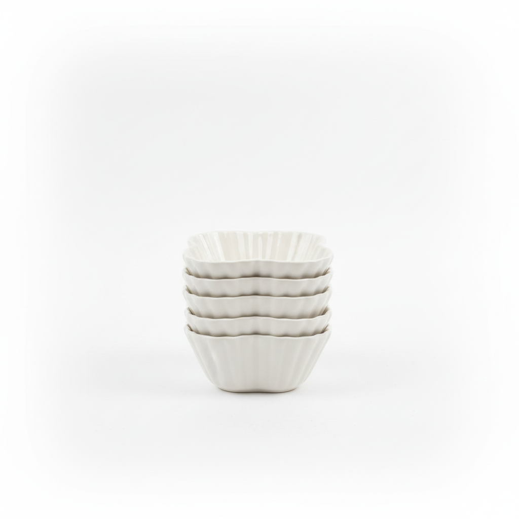 Tas i vogël bardhë prej qeramike me buzë të valëzuara, ideal për servirje elegante në çdo tavolinë. Dizajni i tij praktik lejon grumbullimin e lehtë për kursim hapësire.