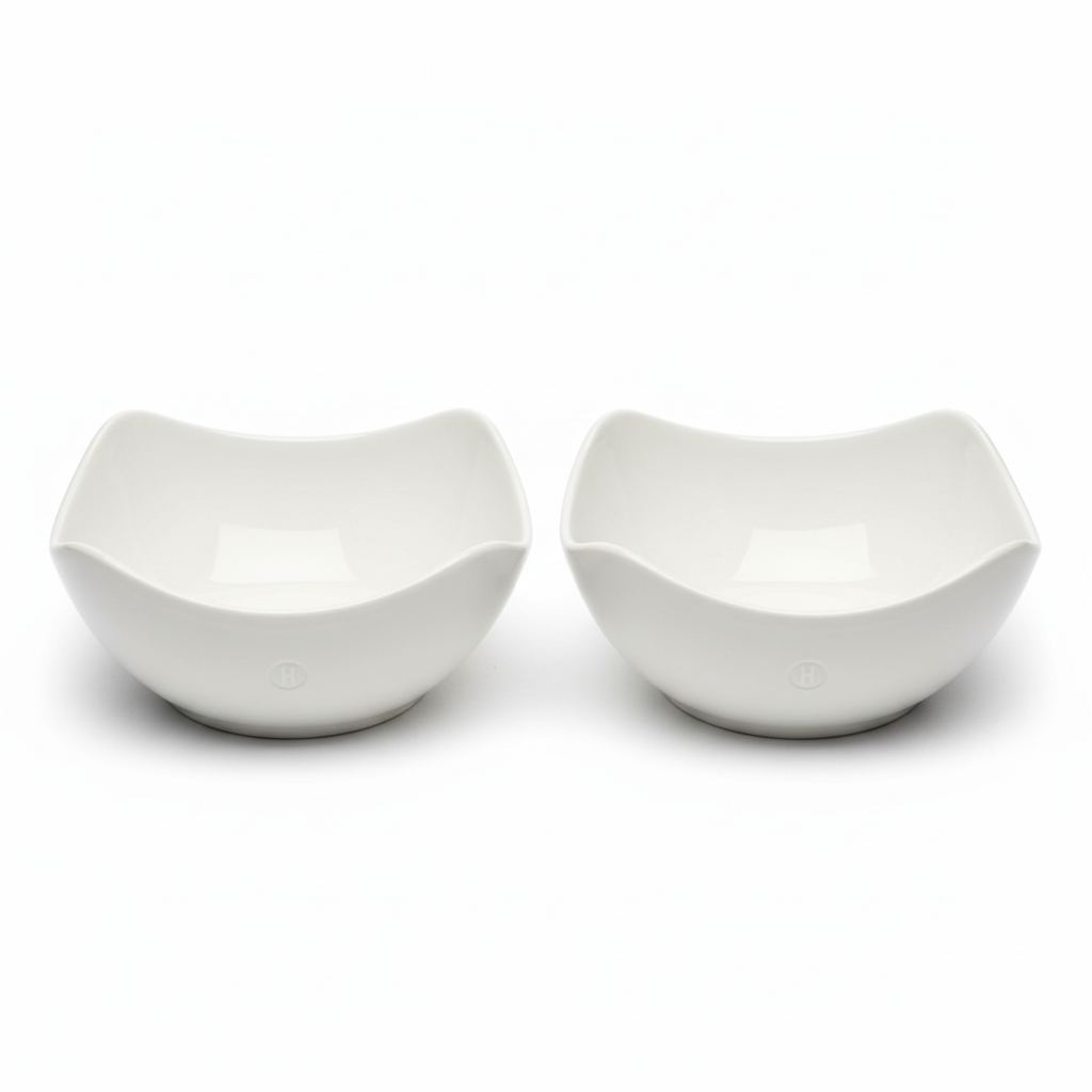 Tas i vogël prej qeramike në ngjyrë të bardhë me formë katrore dhe cepa të rrumbullakosur, ideal për garnitura ose racione të vogla. Dizajni i thjeshtë dhe i lëmuar përshtatet lehtësisht me çdo servisim.