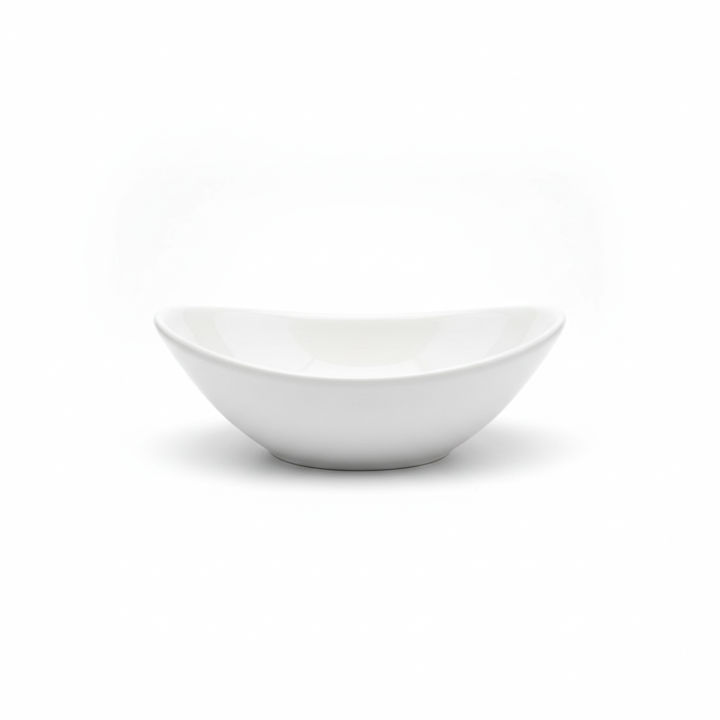 Tasa ovale qeramike e bardhë ofron një pamje të pastër dhe elegante për servirjen e ushqimit në çdo tryezë.