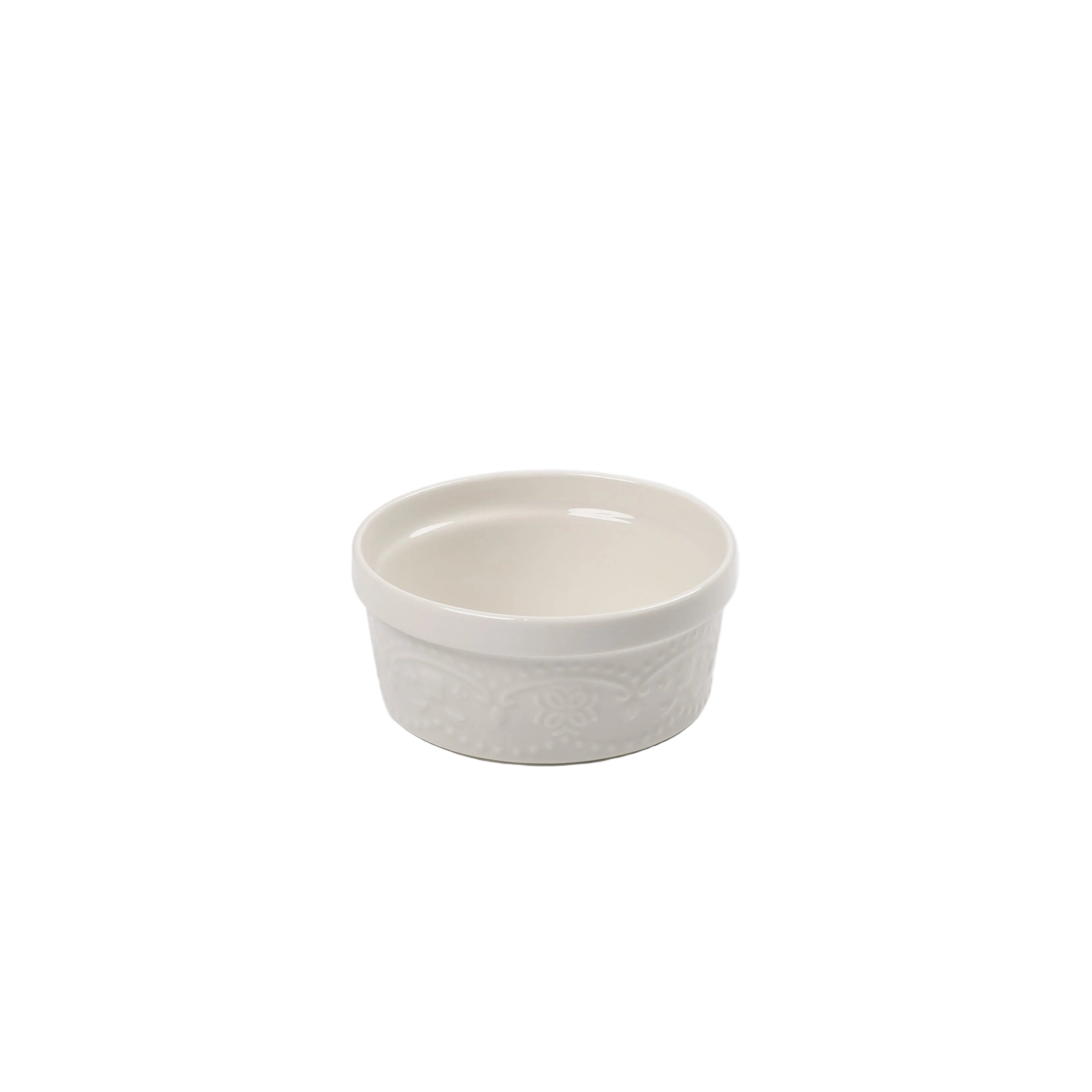 Ky tas i vogël prej qeramike me dizajn të gdhendur është ideal për servirjen e salcave, kremrave, snacks apo ëmbëlsirave të vogla. Detajet dekorative anësore i japin një pamje klasike dhe elegante, duke e bërë të përshtatshëm si për përdorim të përditshëm ashtu edhe për tavolina speciale.