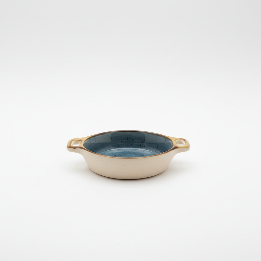 Pjatë mini qeramike për pjekje me dizajn të rrumbullakët, ideale për porcione individuale dhe servirje elegante direkt në tavolinë.