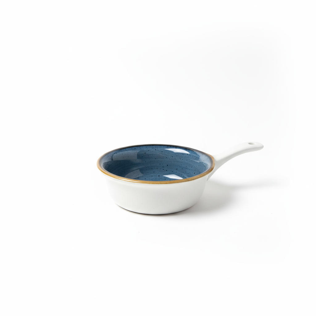 Tas porcelani i vogël me dorezë, me brendësi blu të glazuar dhe buzë ngjyrë ari, ideal për servirje elegante ose pjekje porcionesh të vogla.