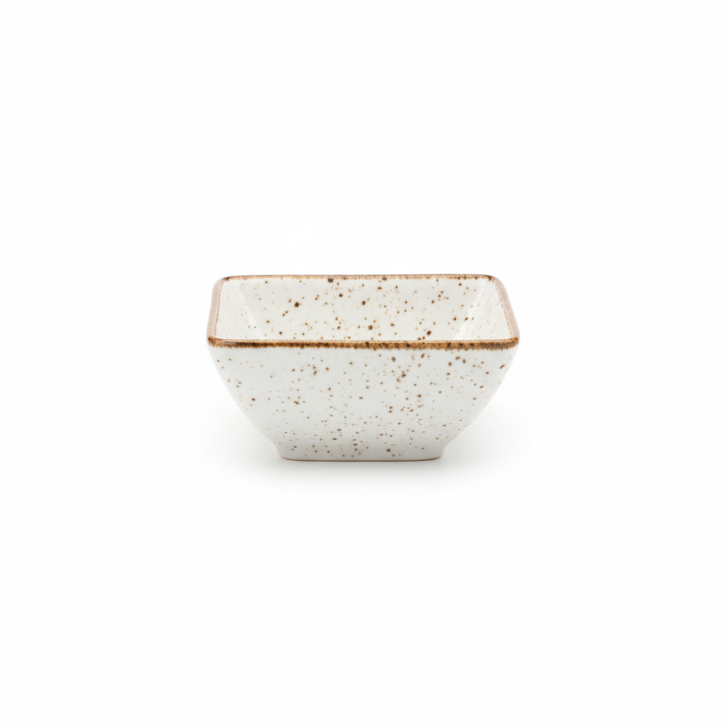 Tas i vogël katror prej porcelani të bardhë, ideal për servirjen e salcave, dip-eve dhe porcioneve të vogla në tryezë. Dizajni me pika dhe buza kafe i jep një pamje moderne çdo shtrimi.