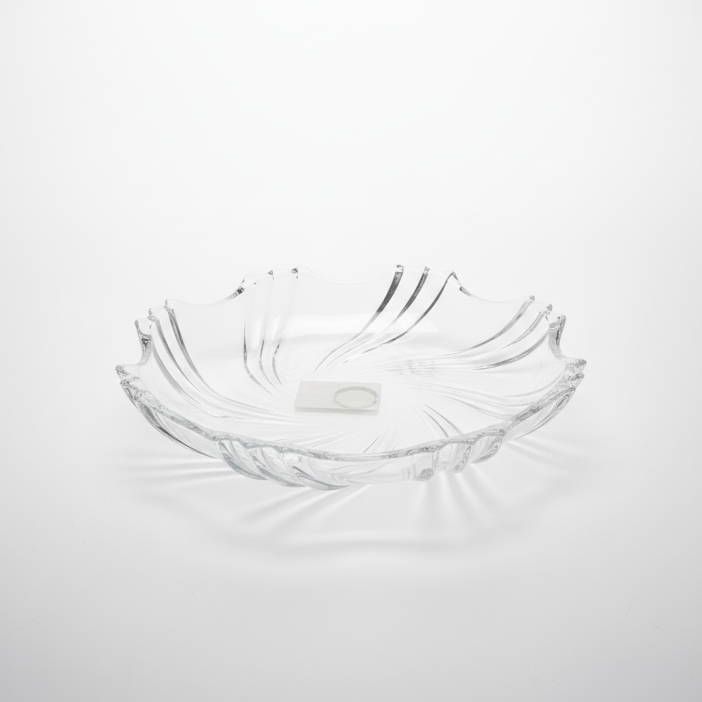 Tasi i xhamit transparent me formë të gjerë dhe të cekët sjell elegancë në servirjen ose ekspozimin e frutave në tryezë. Ngjyra e pastër dhe motivi dekorativ rrotullues e bëjnë një element të rafinuar për çdo ambient.