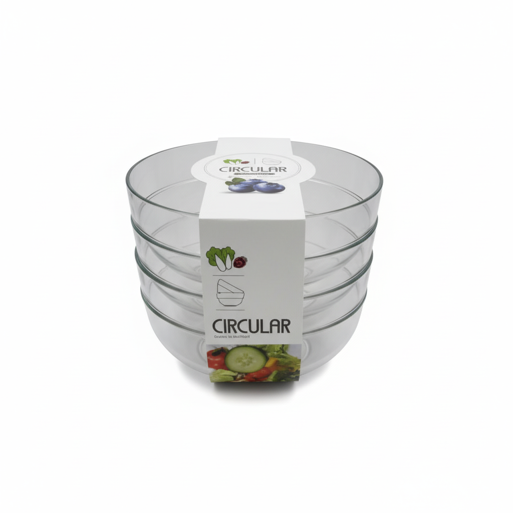Set tasash rrethore transparente ideale për servirjen e sallatave dhe frutave, me dizajn praktik që kursen hapësirë në kuzhinë. Seti me disa pjesë ofron zgjidhje elegante për çdo vakt familjar ose darkë me miq.