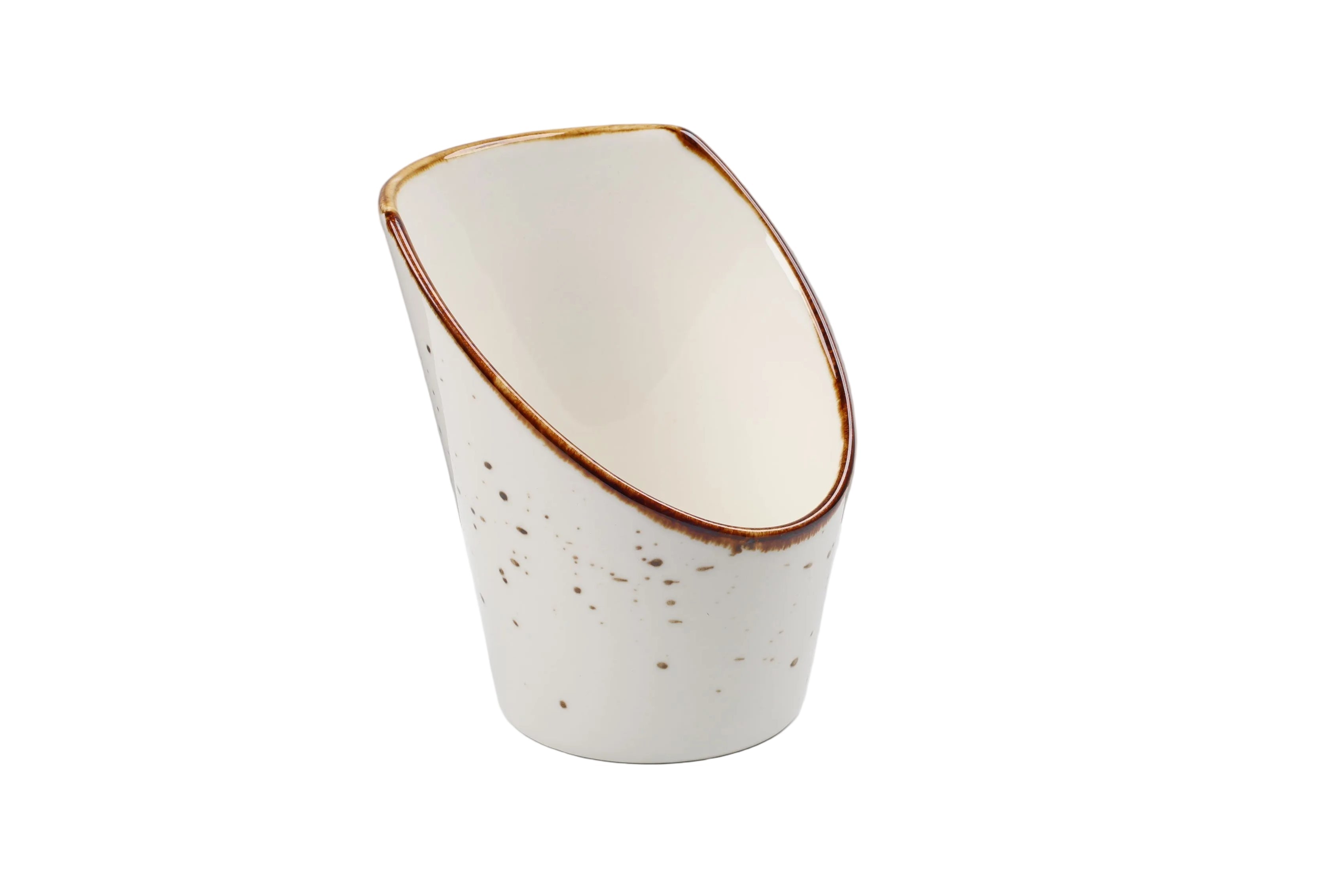 Tas elegant dhe modern prej porcelani cilësor, me formë unike të pjerrët që i jep një stil shumë të veçantë në tavolinë. Ngjyra e bardhë me pika dekorative dhe buzë gold krijojnë një pamje artizanale dhe luksoze.