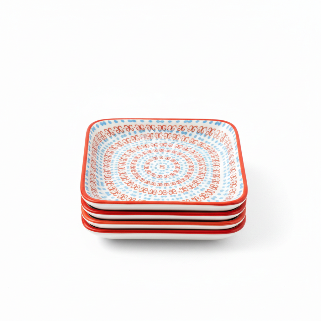 Ky tas i vogël porcelani me formë katrore dhe cepat e rrumbullakët sjell një pamje moderne në çdo tryezë, falë dekorit të tij në ngjyra bojqelli dhe të kuqe. Sipërfaqja e lëmuar me shkëlqim e bën ideal për servirje të vogla, meze, salca ose ëmbëlsira individuale. Madhësia rreth 9.5 cm e bën praktik si pjatë shoqëruese në çdo vakt.