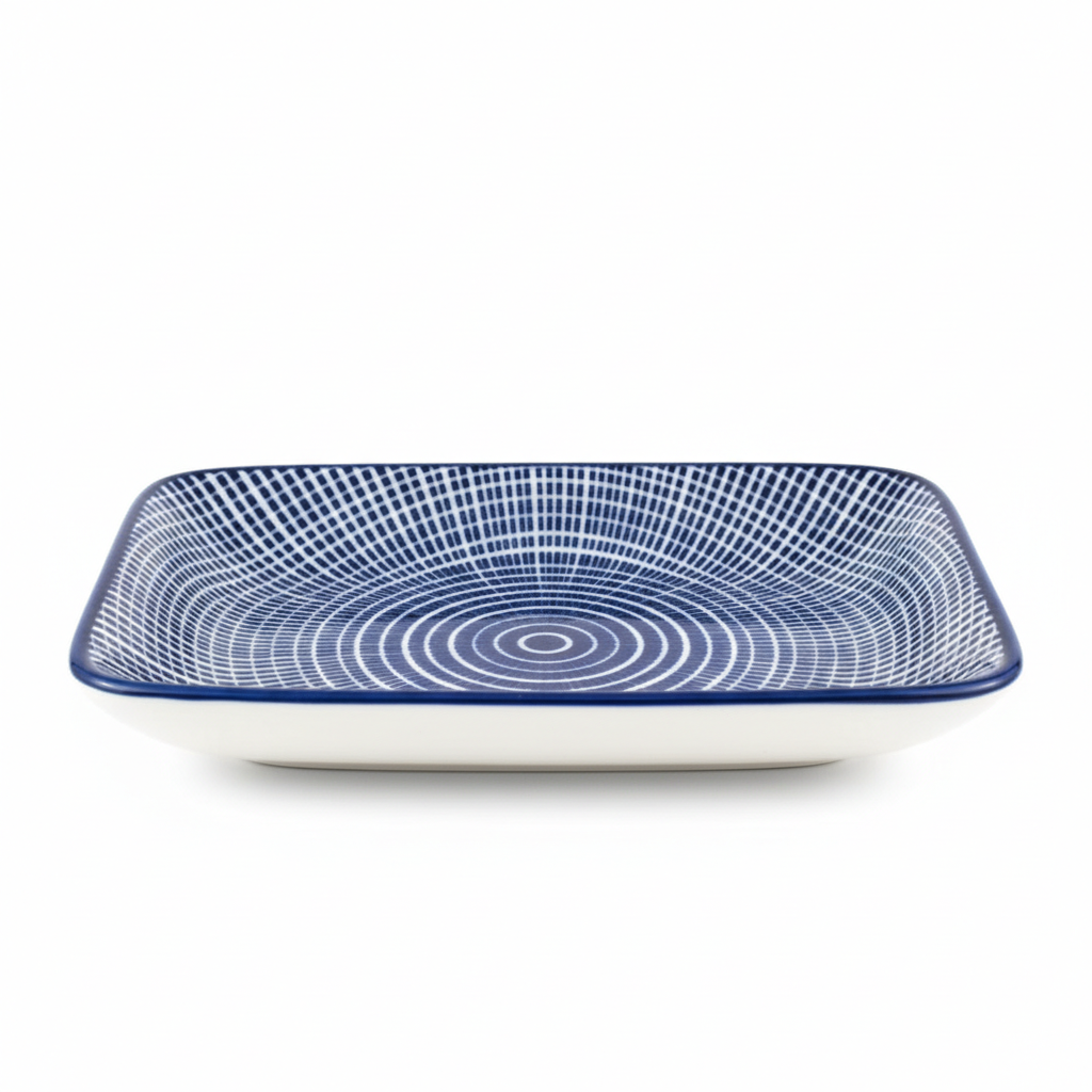 Ky tas i vogël prej porcelani me formë katrori dhe diametër rreth 9.8 cm sjell një prekje të rafinuar në çdo tryezë. Dekori në ngjyrë bardhë-blu me vijat koncentrike brenda e bën ideal si aksesuar dekorativ, por edhe për servirjen e porcioneve të vogla apo snack-eve.