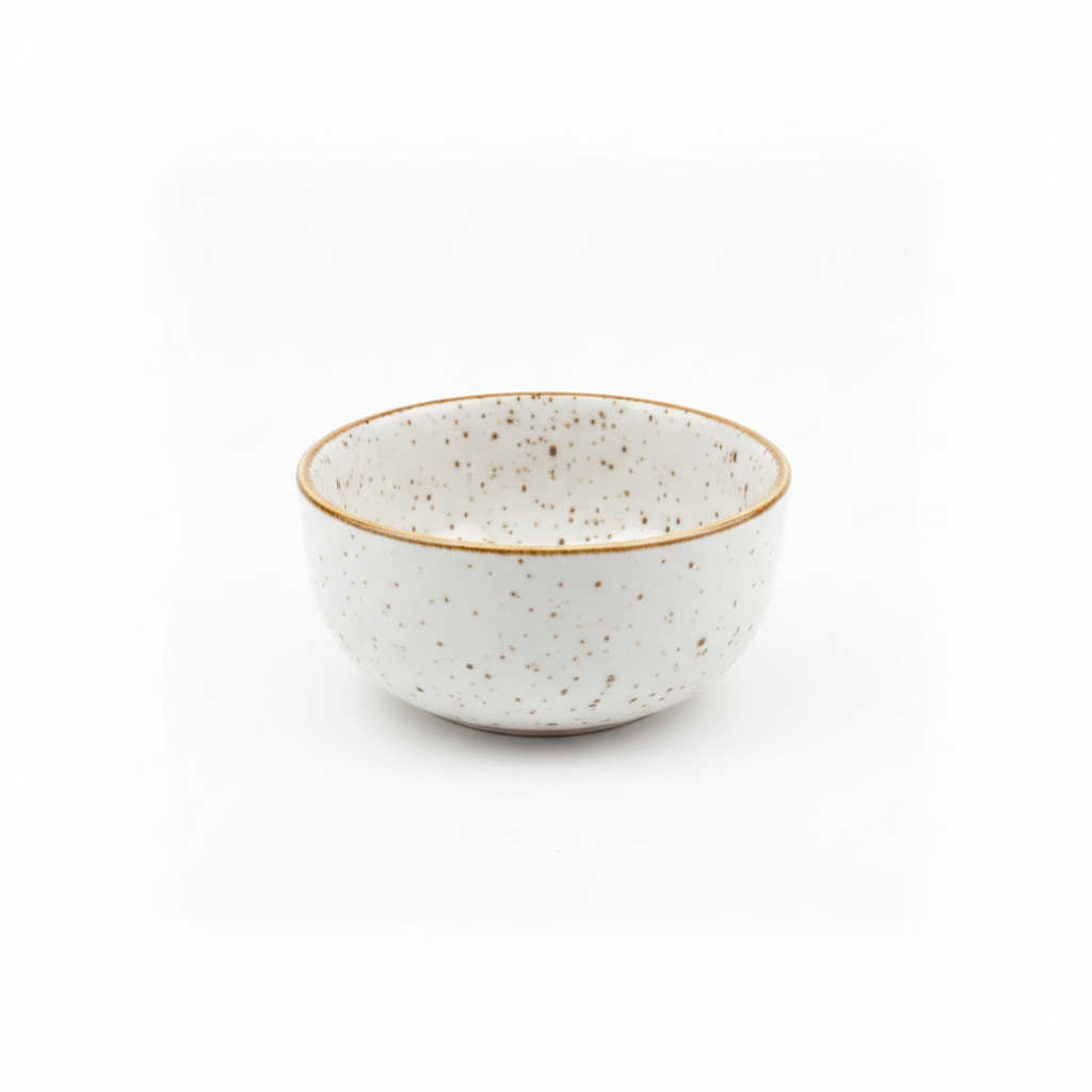 Tasi i vogël prej porcelani 9 cm kombinon ngjyrën e bardhë elegante me një buzë gold dhe dizajn me pika në brendësi, ideal për servirje të kuruar në çdo tryezë. Madhësia kompakte e bën të përsosur për salca, dipa ose ëmbëlsira të vogla.