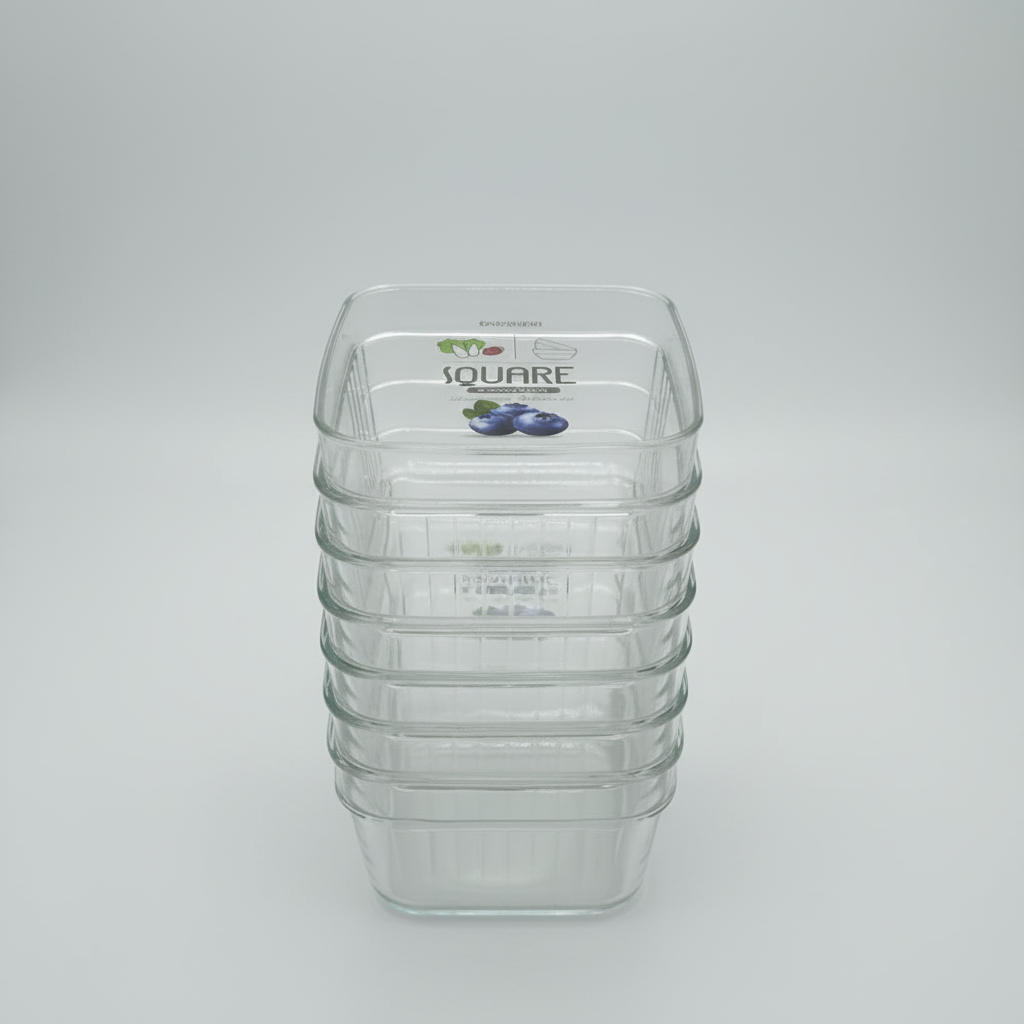 Set prej 6 enësh katrorë transparentë, idealë për shërbimin elegant të sallatave, frutave dhe ushqimeve të tjera në tryezë.