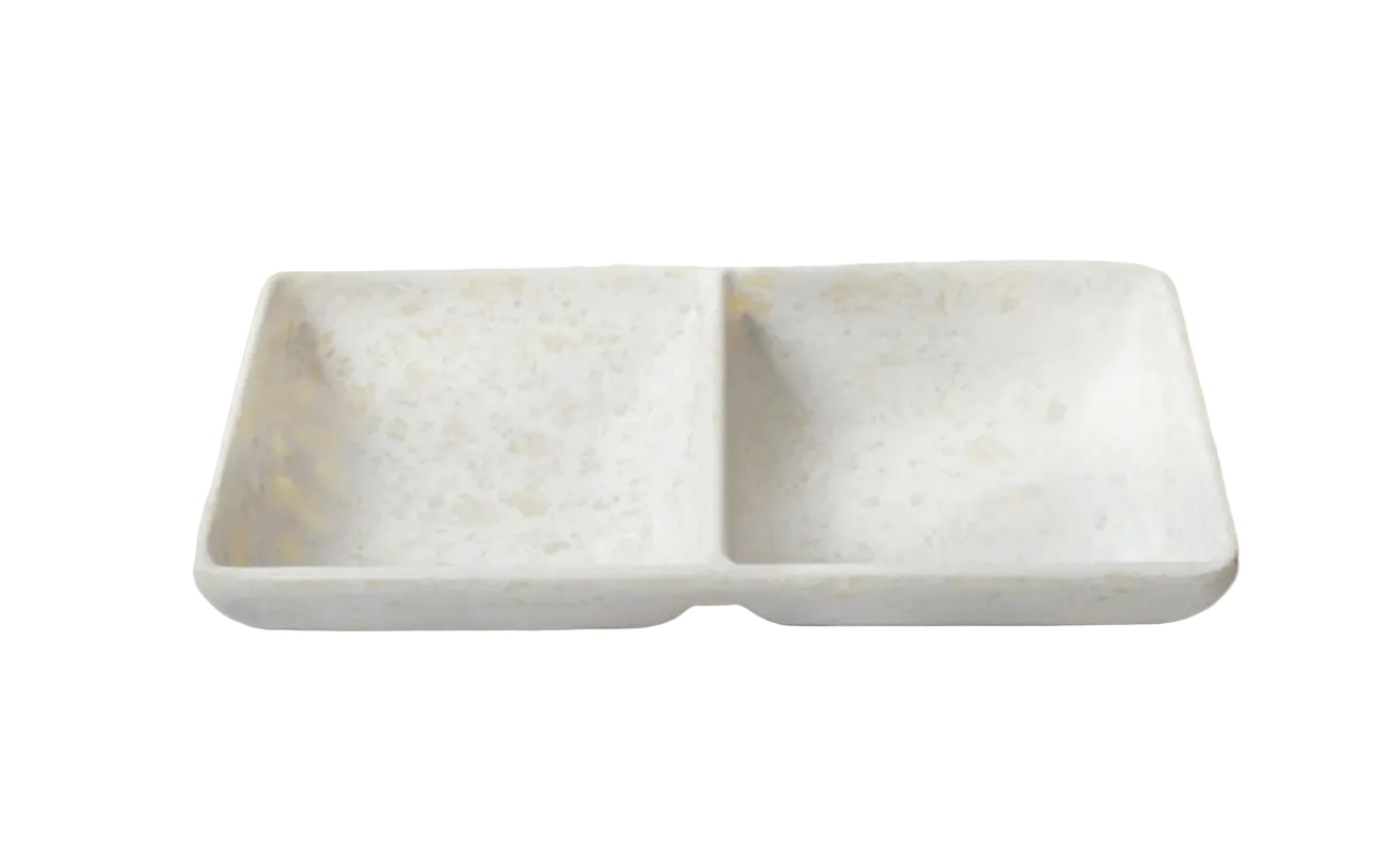 Kjo pjatë e dyfishtë me formë drejtkëndore është zgjidhja ideale për servirime praktike dhe të organizuara. Dy ndarjet e saj ju lejojnë të shërbeni ushqime të ndryshme njëkohësisht, pa i përzier, duke e bërë perfekte për salca, snacks, fruta të thata apo antipasta.