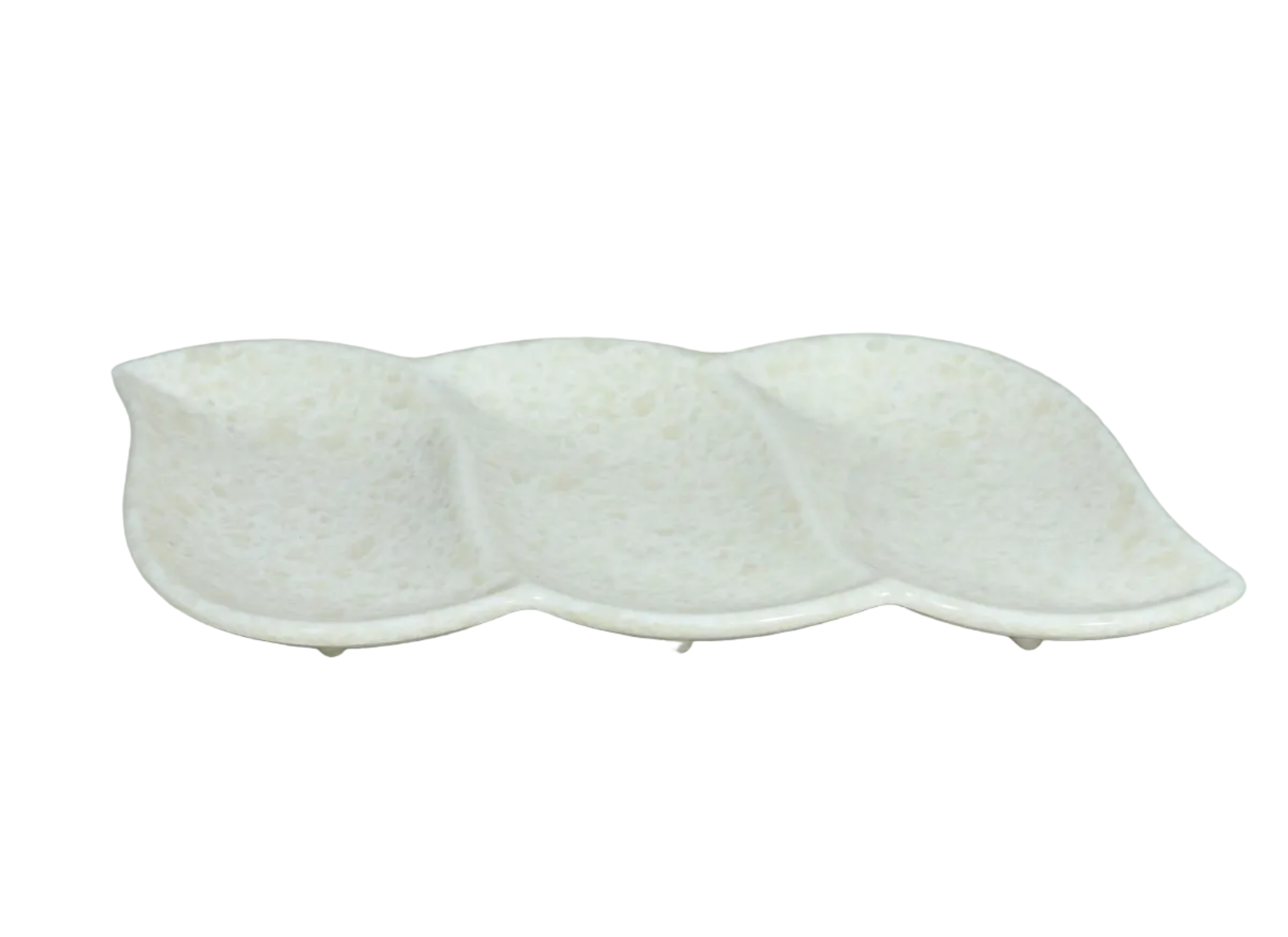 Kjo pjatë e trefishtë me dizajn modern dhe teksturë delikate është ideale për servirime të organizuara dhe elegante. Tre ndarjet e integruara ju lejojnë të shërbeni ushqime të ndryshme në të njëjtën kohë, pa i përzier, duke e bërë perfekte për salca, snacks, fruta të thata apo antipasta.
