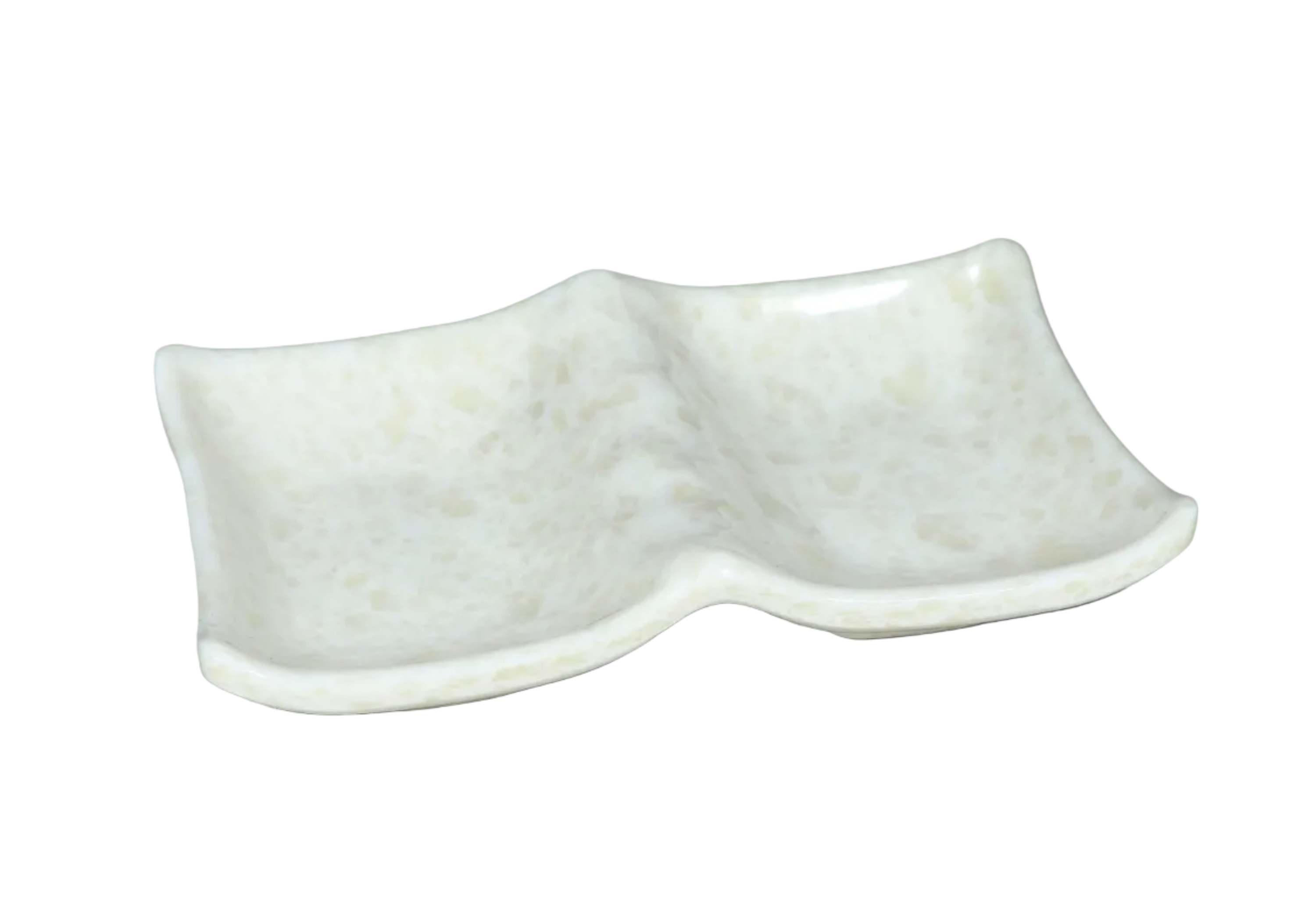 Kjo pjatë e dyfishtë me dizajn modern dhe teksturë delikate është ideale për servirime praktike dhe elegante. Forma e saj me dy ndarje ju lejon të shërbeni ushqime të ndryshme njëkohësisht, pa i përzier, duke e bërë perfekte për salca, snacks, fruta të thata apo antipasta.