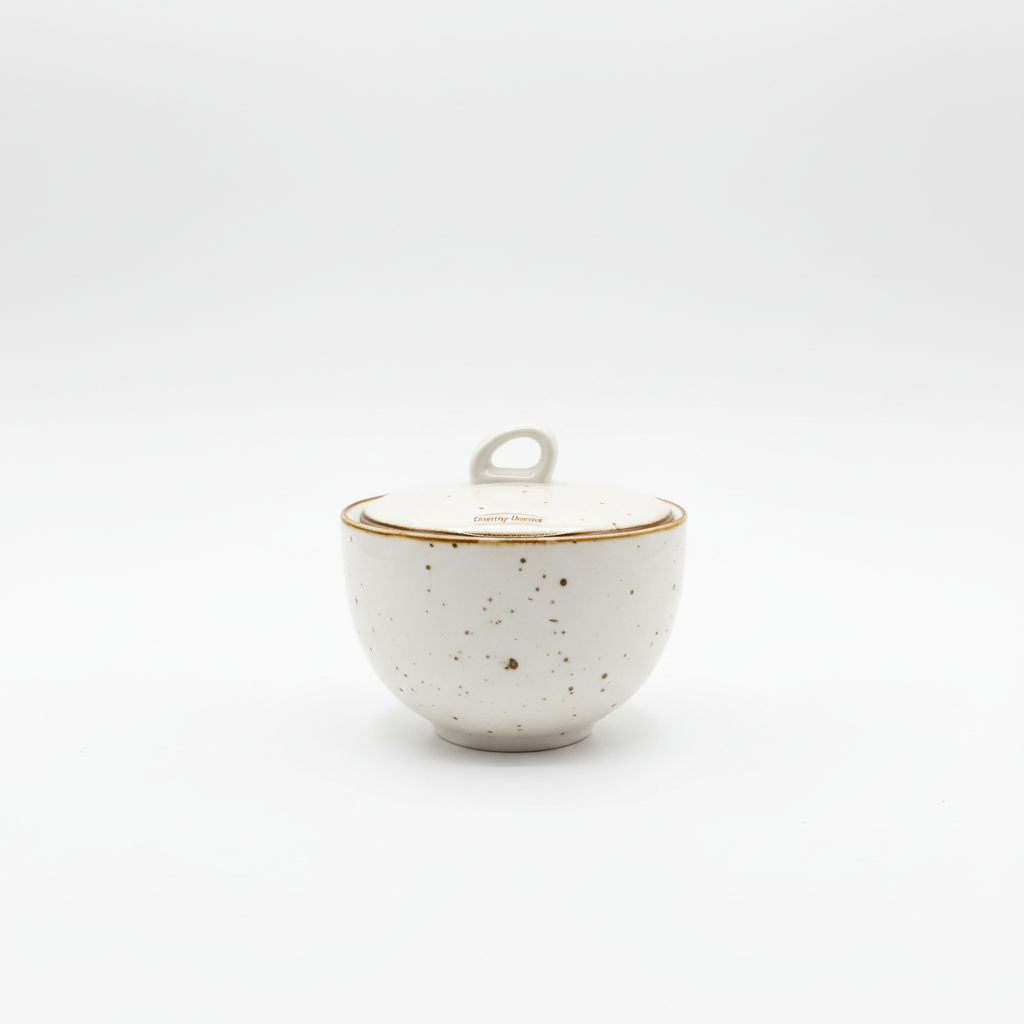 Sheqerkore qeramike elegante me qelqim të bardhë me pika kafe dhe bordurë kontrastuese kafe, e kompletuar me kapak praktik me dorezë unazë. Pjesë e një koleksioni enësh darke të koordinuara, ideale për tavolinën e përditshme apo për mysafirë.