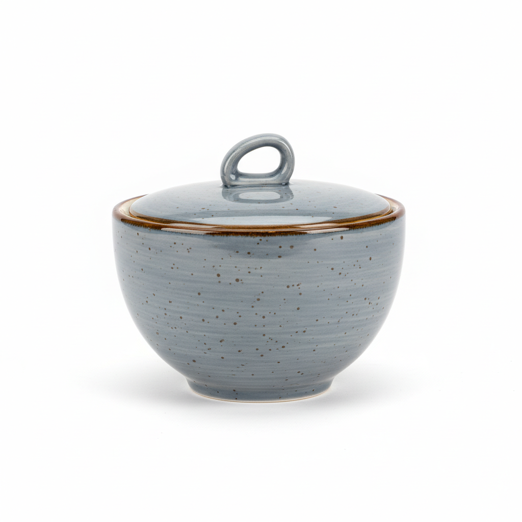 Tas porcelani në ngjyrë blu me shkëlqim dhe kapak të përshtatur, i dekoruar me pika të imta për një pamje unike dekorative.