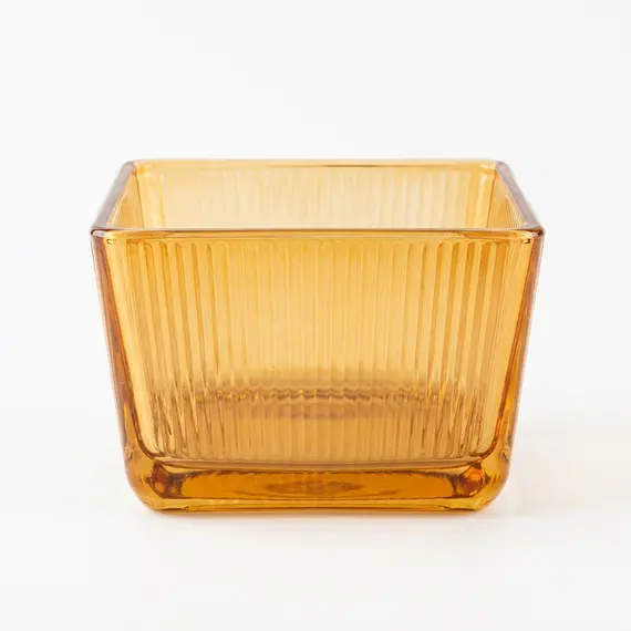 Kjo enë elegante me formë drejtkëndore dhe ngjyrë të ngrohtë amber sjell prekje moderne në çdo tryezë apo banak. Muret e jashtme me reliev vijor krijojnë lojë drite dhe e bëjnë servirjen të duket më e rafinuar, ndërsa qelqi i trashë siguron përdorim të qëndrueshëm. Dizajni me hapje të gjerë e bën të praktikshme si për servirje, ashtu edhe për organizim apo ruajtje.