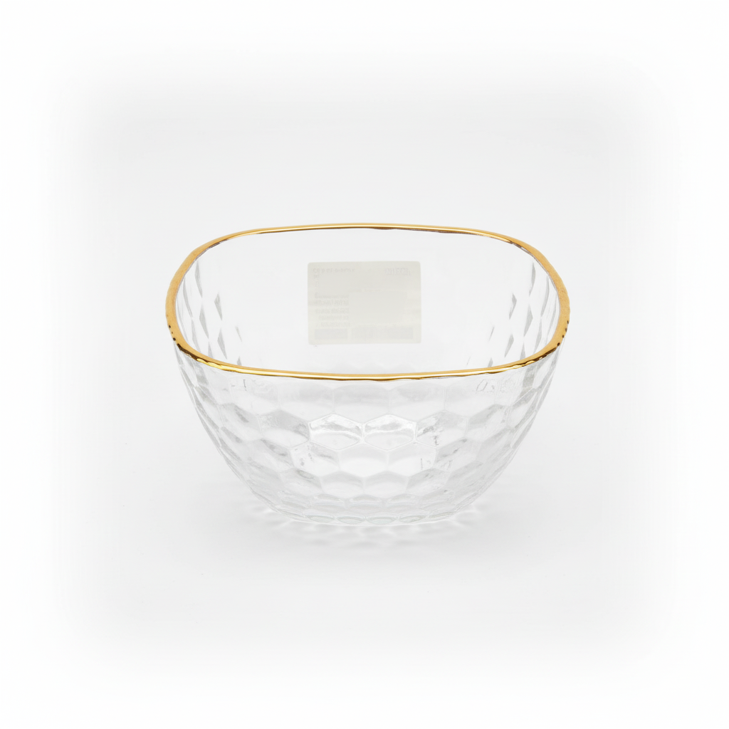 Tas i vogël qelqi me sipërfaqe të teksturuar dhe buzë dekorative ngjyrë ari, ideal për servirje elegante në tryezë. Forma e tij katrore e rrumbullakosur sjell një prekje moderne në çdo kuzhinë.