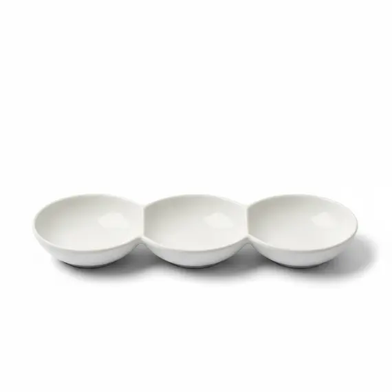 Kjo enë servirjeje me 3 pjese të rrumbullakëta të lidhura është ideale për të shërbyer meze, salca, dip-e dhe erëza në mënyrë të organizuar dhe stil. Materiali qeramik i bardhë me shkëlqim i jep tavolinës një pamje moderne dhe kombinohet lehtë me çdo set enësh.
