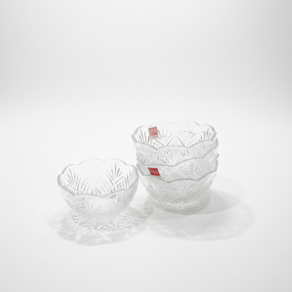 Set me 4 tasa qelqi transparentë me model dekorativ prerjeje, të përshtatshëm për servirjen elegante të sallatave, ëmbëlsirave ose snack-eve. Madhësi praktike rreth 11.7 x 5.8 x 6.5 cm për porcione individuale.
