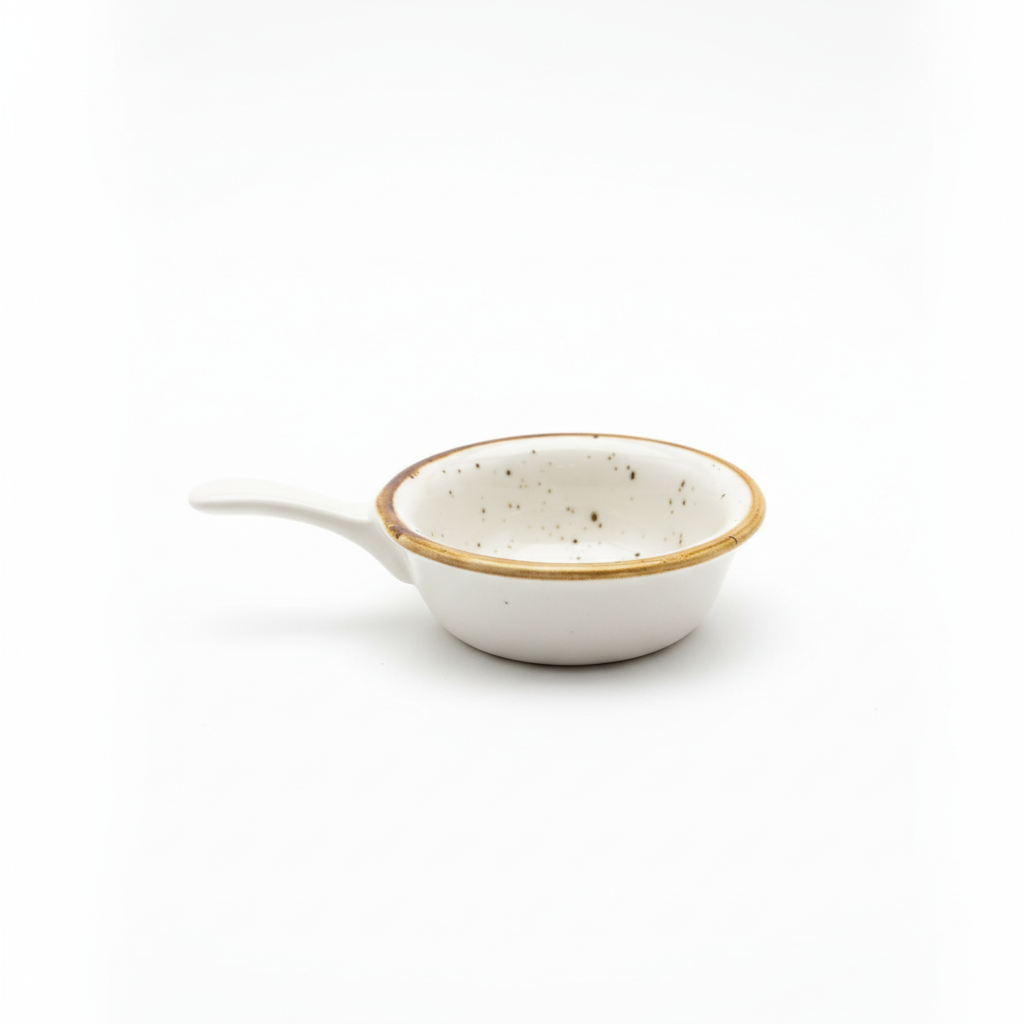 Tas i vogël qeramike me glazurë të bardhë, buzë kafe dhe dizajn me pika, ideal për servirjen e salcave, erëzave ose porcioneve të vogla. Dizajni i tij minimalist përshtatet lehtësisht me çdo shtruar tavoline.