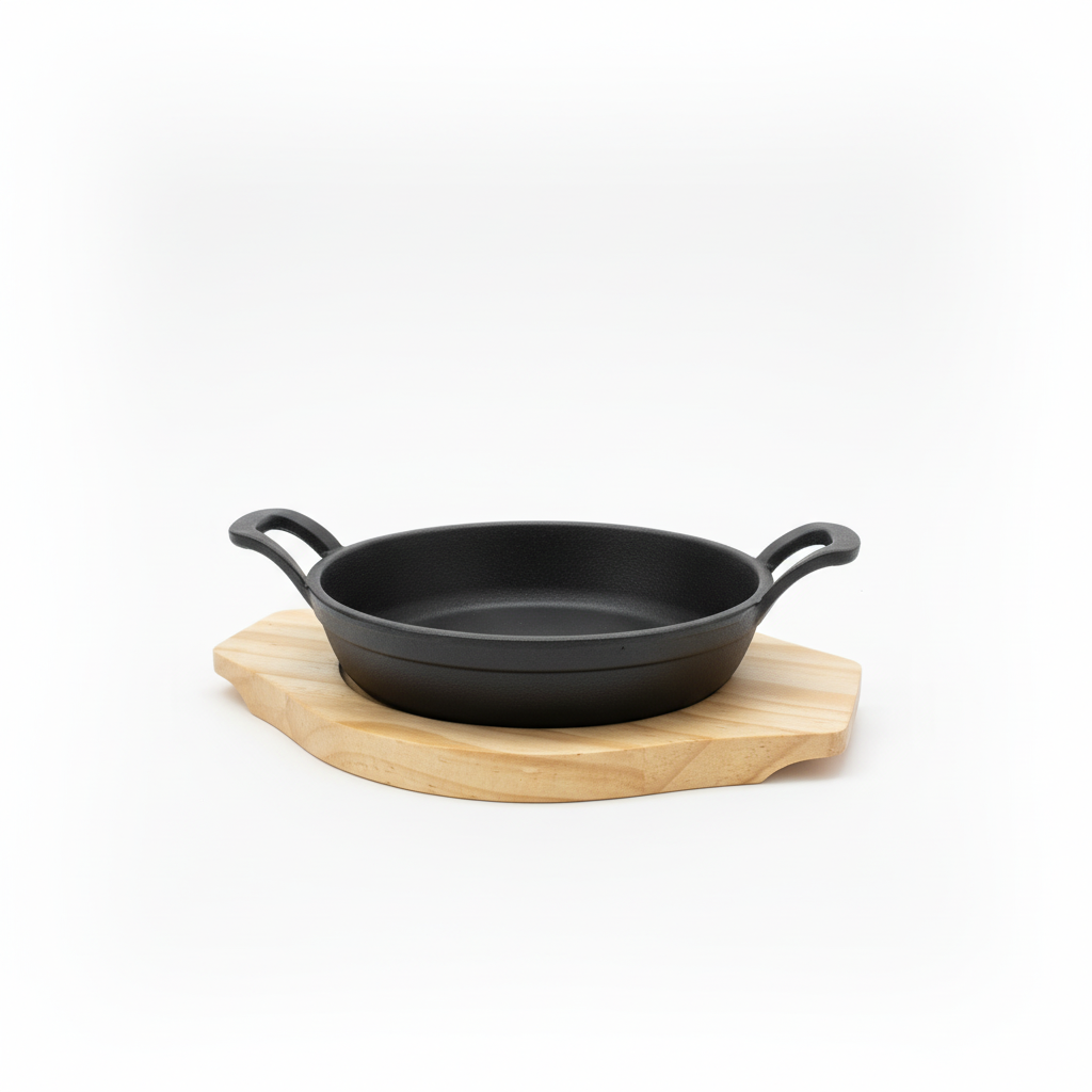 Tavë rrethore gize me doreza anësore dhe bazë prej druri për servirje të sigurt dhe elegante direkt nga furra ose grilli në tavolinë.