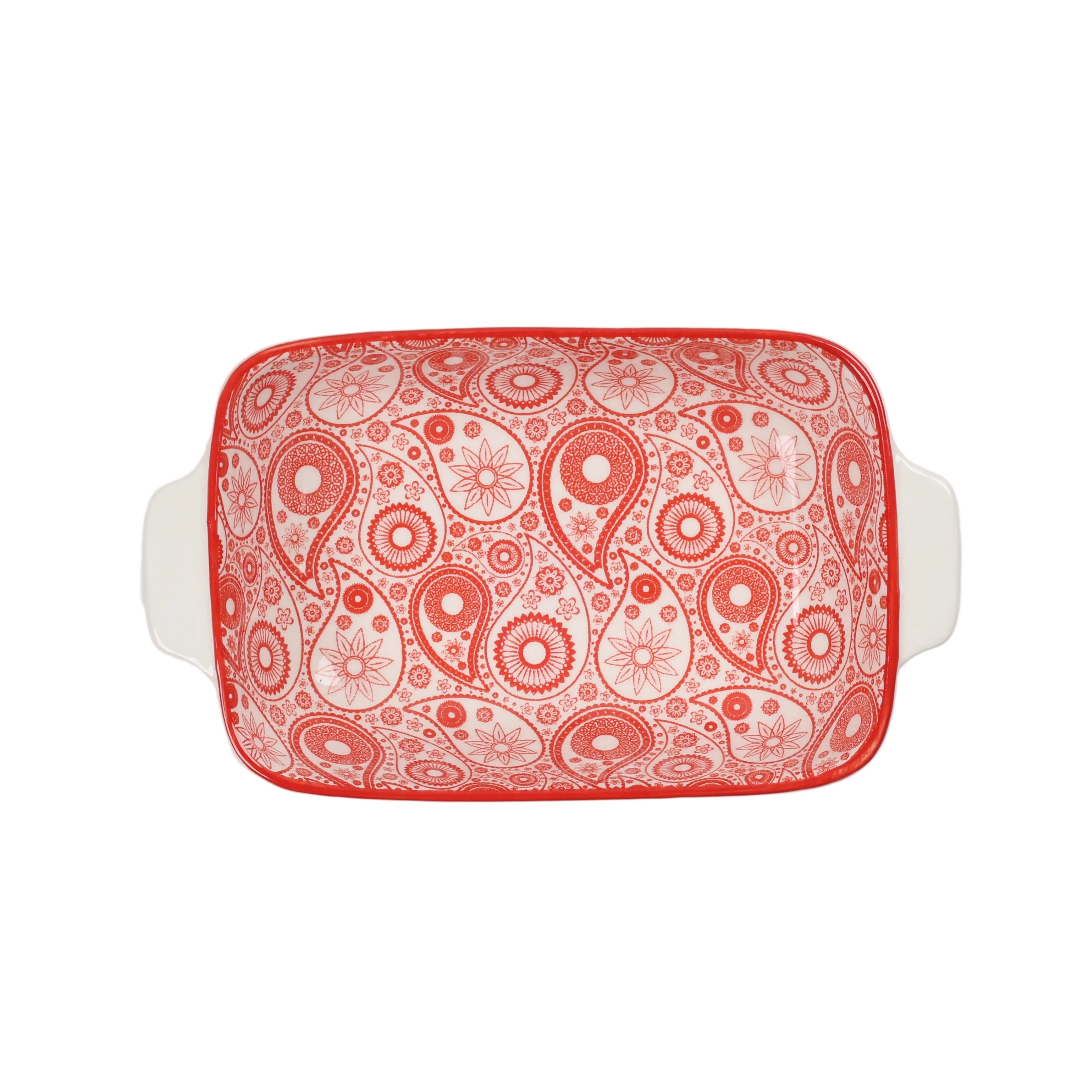 Kjo tavë pjekjeje prej porcelani është ideale për përgatitjen dhe servirjen e gatimeve të vogla në mënyrë elegante. Me dizajn dekorativ bardhë-kuqe dhe motive fine, i jep tryezës një pamje të veçantë dhe moderne.