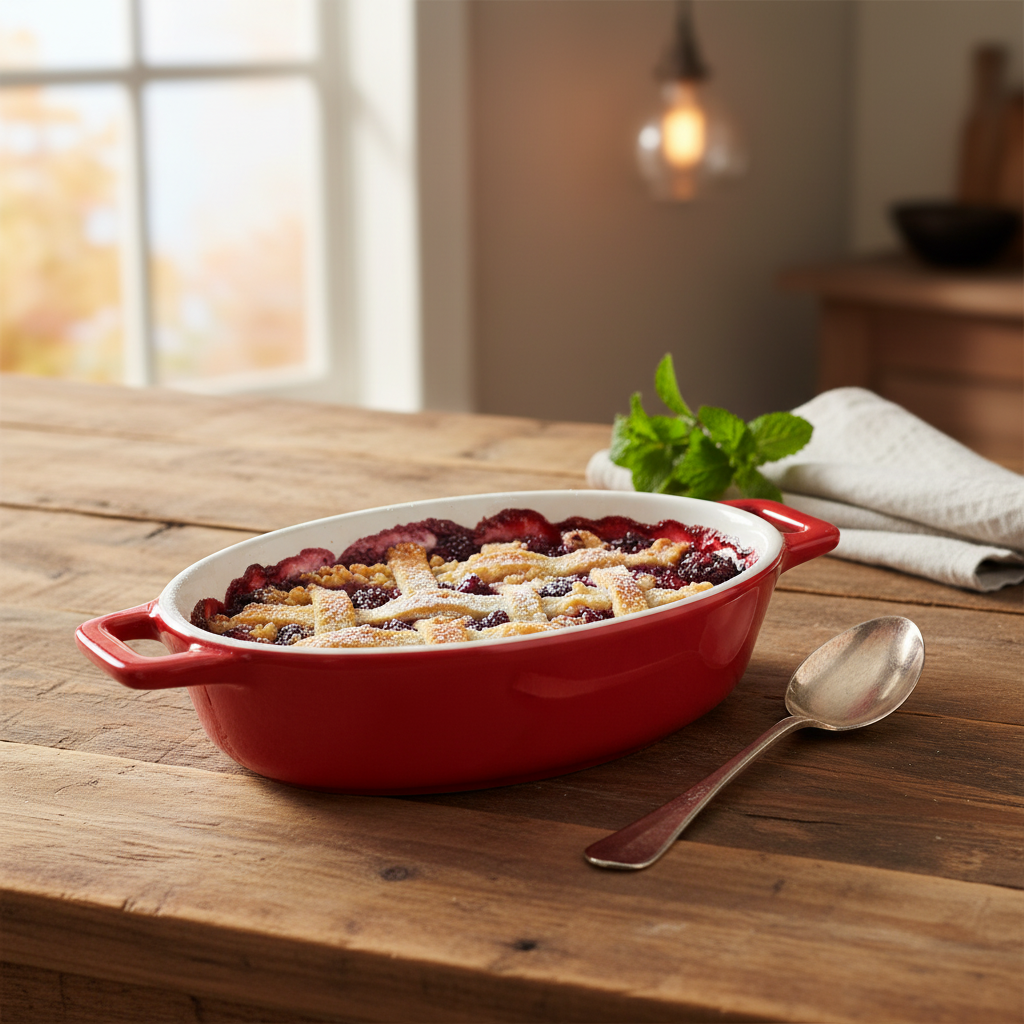 Enë ovale qeramike 23 cm me sipërfaqe të bardhë dhe pjesë të jashtme të kuqe, e përshtatshme si për pjekje ashtu edhe për servirje direkt në tryezë. Dizajni praktik me doreza anësore lehtëson transportin nga furra te tavolina.