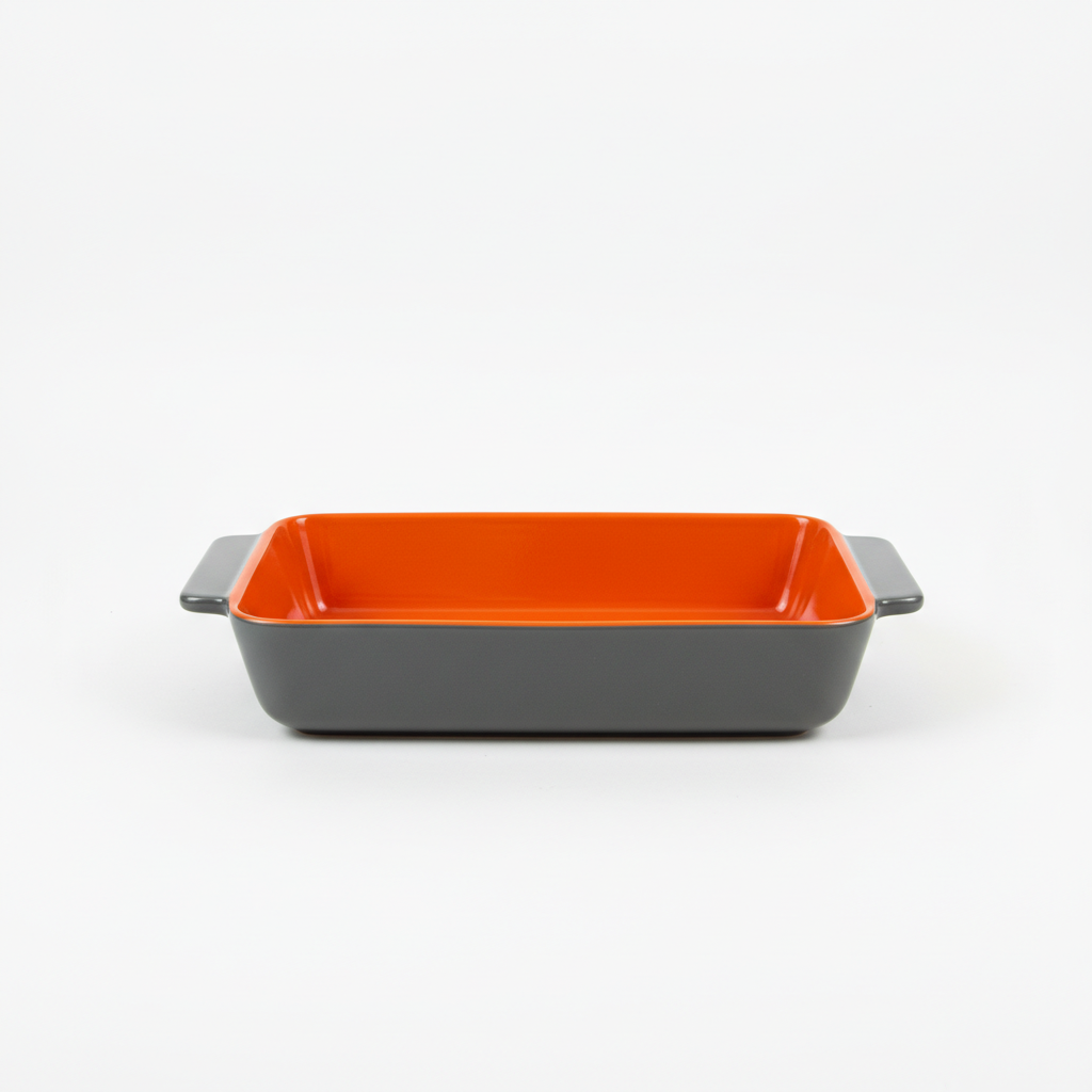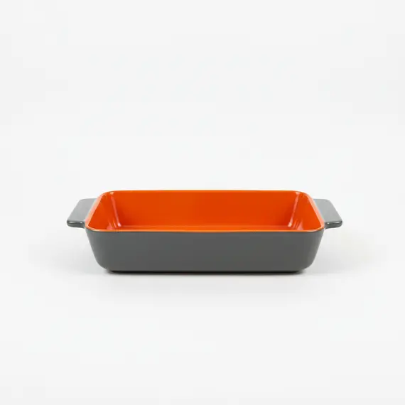 Tava kompakte prej porcelani në ngjyrë portokalli është ideale për pjekje në furrë dhe servirje të drejtëpërdrejtë në tryezë. Dorezat anësore e bëjnë të lehtë vendosjen dhe nxjerrjen nga furra.