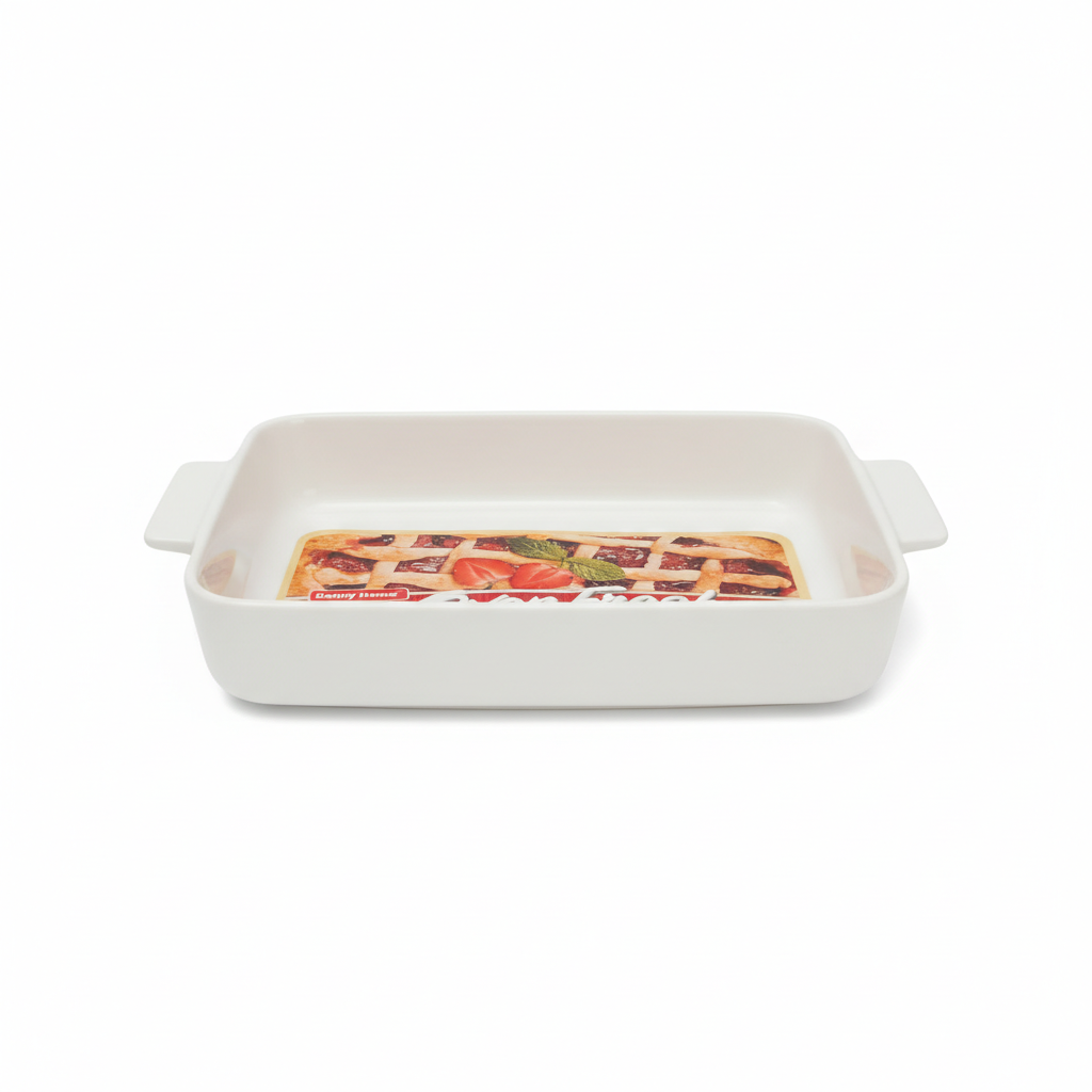 Pjata prej porcelani super të bardhë të punuar me dorë ofron prezantim elegant direkt nga furra në tryezë. Forma drejtkëndore me doreza anësore e bën të lehtë futjen dhe nxjerrjen nga furra, si dhe transportin e sigurt të gatimit. Materiali rezistent është i përshtatshëm për mikrovalë dhe lavastovilje, duke kursyer kohë në nxehje dhe pastrim. Përmasat rreth 30.5 x 17.5 x 5.5 cm janë ideale për tava, lazanja, ëmbëlsira dhe pjata të tjera familjare.
