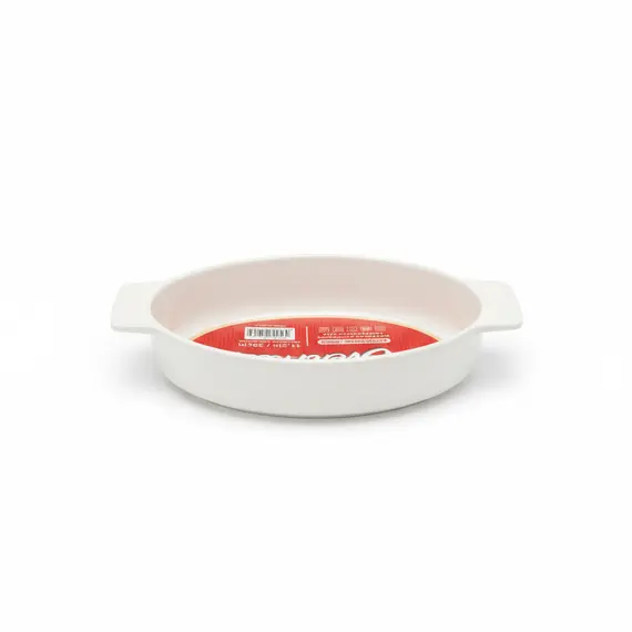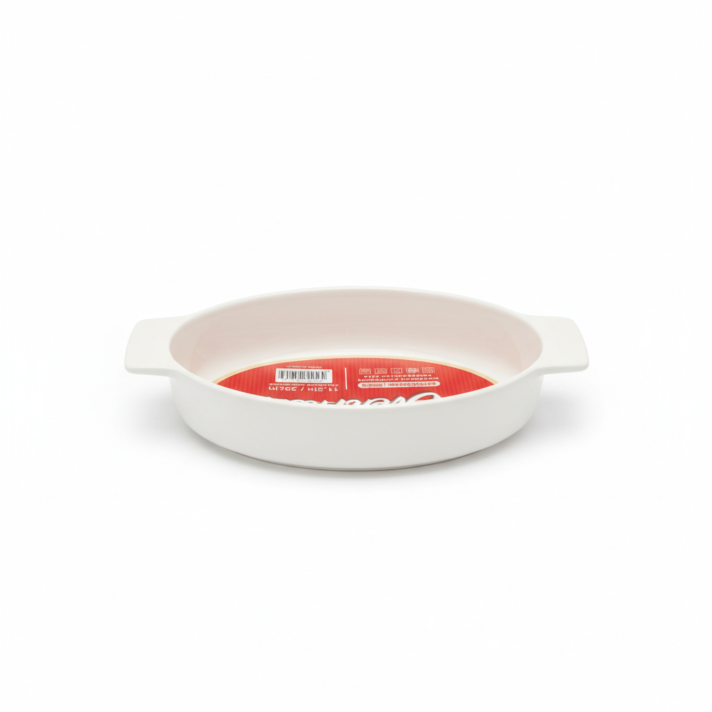 Tavë pjekje rrethore prej porcelani të bardhë me doreza anësore, ideale për gatime të ndryshme në furrë. Përmasa praktike e bëjnë të përshtatshme për përdorimin e përditshëm në kuzhinë.