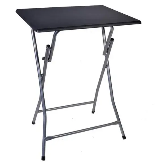Tavolinë e palosshme drejtkëndore me një hapje mbyllëse. E bërë prej çeliku dhe sipërfaqja është prej druri (MDF), ka mbrojtës për këmbët për të parandaluar shenjat në dysheme dhe mbyllje të lehtë. Ngjyra e zezë Materiali i produktit Plastike Gjatësia x Gjerësia x Lartësia 48x38x65cm