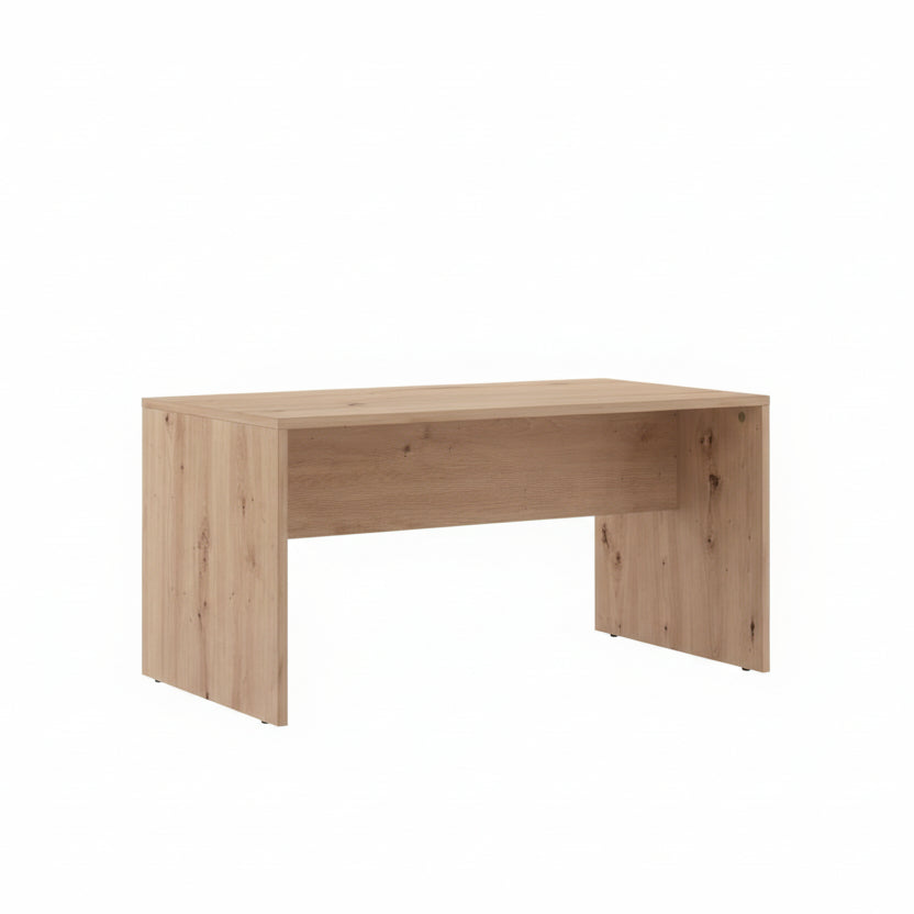 Tavolinë mesi me dizajn të thjeshtë dhe modern, e realizuar në efekt druri natyral që sjell ngrohtësi dhe elegancë në ambient. Forma e pastër dhe hapësira poshtë tavolinës ofrojnë funksionalitet për vendosjen e librave apo aksesorëve.