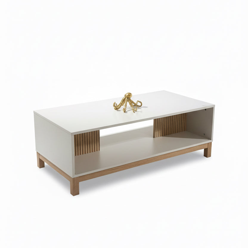 Kjo tavolinë kafeje moderne ka një dizajn minimalist dhe bashkëkohor, duke kombinuar ngjyrën e bardhë të pastër me këmbë dhe detaje druri natyral për të krijuar një pamje elegante dhe të freskët. Hapesira e hapur ofron mundësi ruajtjeje të sendeve të ndryshme, ndërsa pamja e thjeshtë dhe praktike është e përshtatshme për çdo dhomë ndenje moderne.