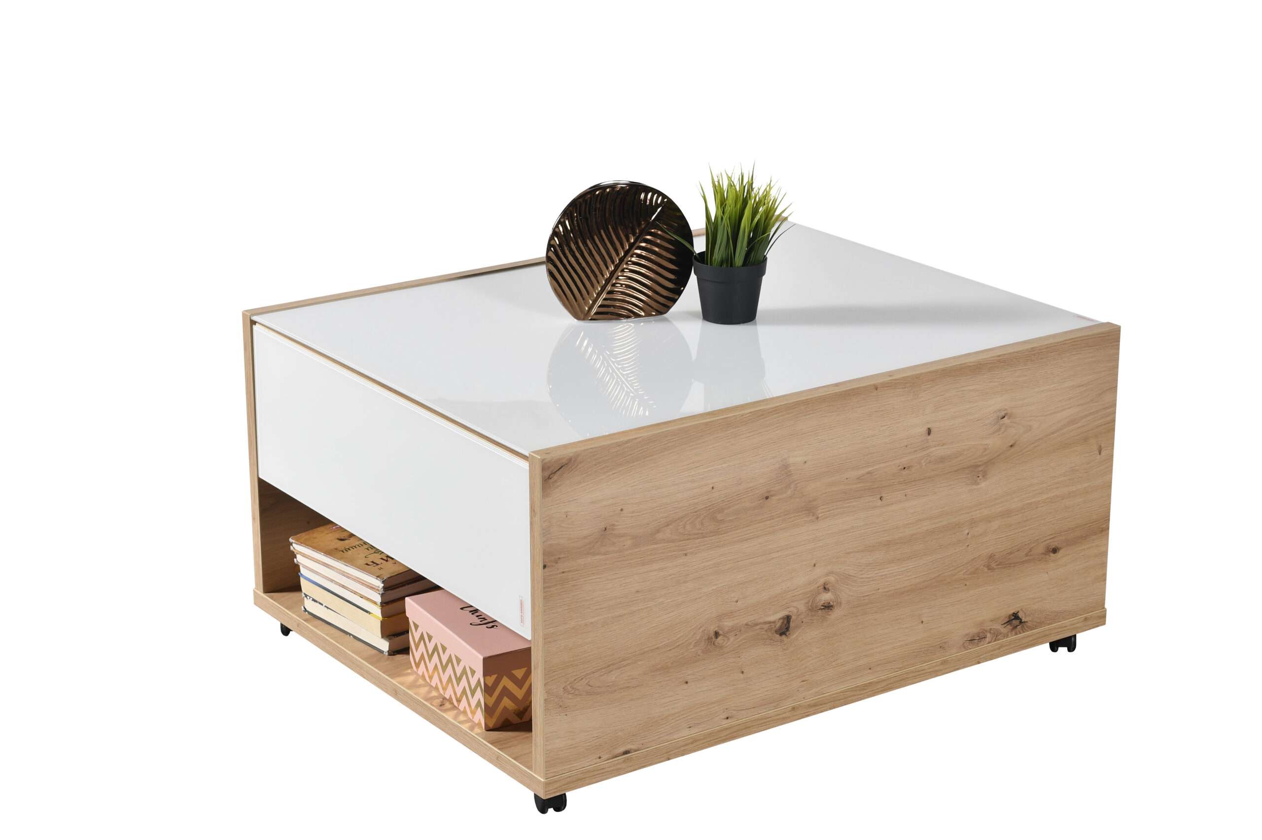 Tavolinë mesi me dizajn bashkëkohor, e kombinuar me sipërfaqe të bardhë me shkëlqim dhe strukturë në efekt druri natyral. Hapësira e poshtme ofron vend praktik për libra, revista apo aksesorë të ndryshëm.