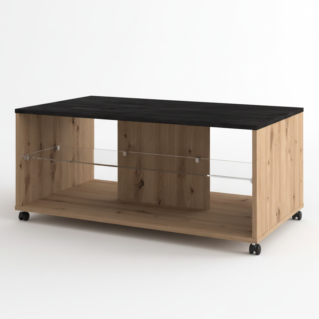 Tavolinë mesi me dizajn bashkëkohor, e kombinuar me sipërfaqe në ngjyrë të errët dhe strukturë në efekt druri natyral. Rafti prej qelqi ofron hapësirë praktike për libra, dekorime apo aksesorë të përditshëm.