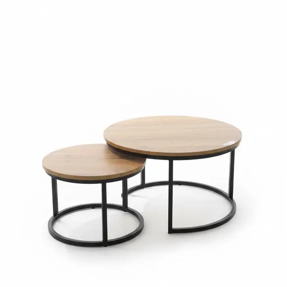 Ky set tavolinash kafeje përbëhet nga dy tavolina të ndryshme me sipërfaqe të rrumbullakosura dhe strukturë metalike të zezë, duke krijuar një pamje moderne dhe të thjeshtë. Dizajni minimal dhe kombinimi i drurit me metalin i jep një estetikë të ngrohtë dhe industriale, që është perfekte për çdo dhomë ndenje.