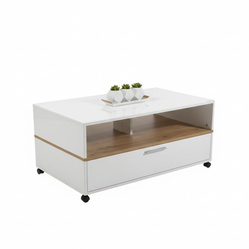 Kjo tavolinë kafeje moderne ofron një dizajn të thjeshtë dhe funksional me sipërfaqe të bardhë dhe detaje druri natyral. E pajisur me një raft të hapur për ruajtjen e sendeve të ndryshme dhe një sirtar për ruajtjen e objekteve më të vogla, kjo tavolinë është perfekte për dhomën e ndenjës tuaj.