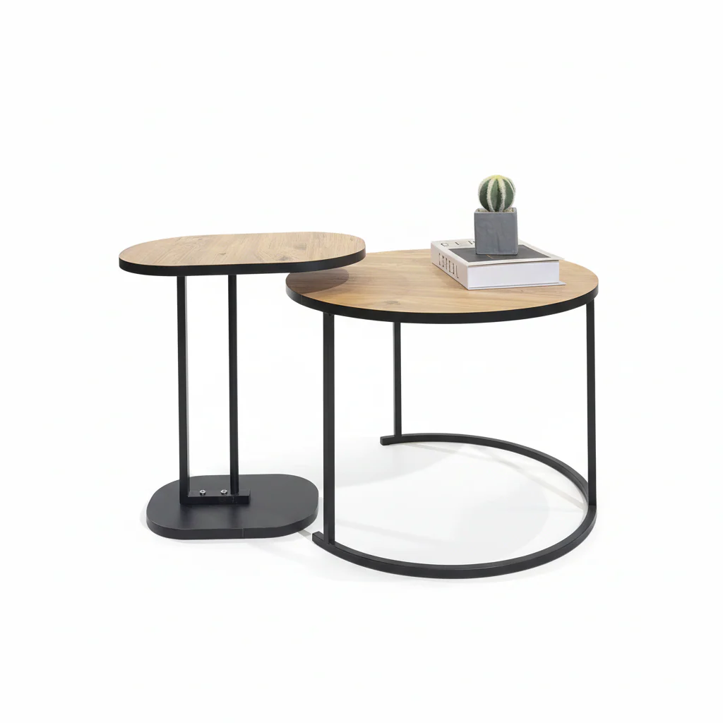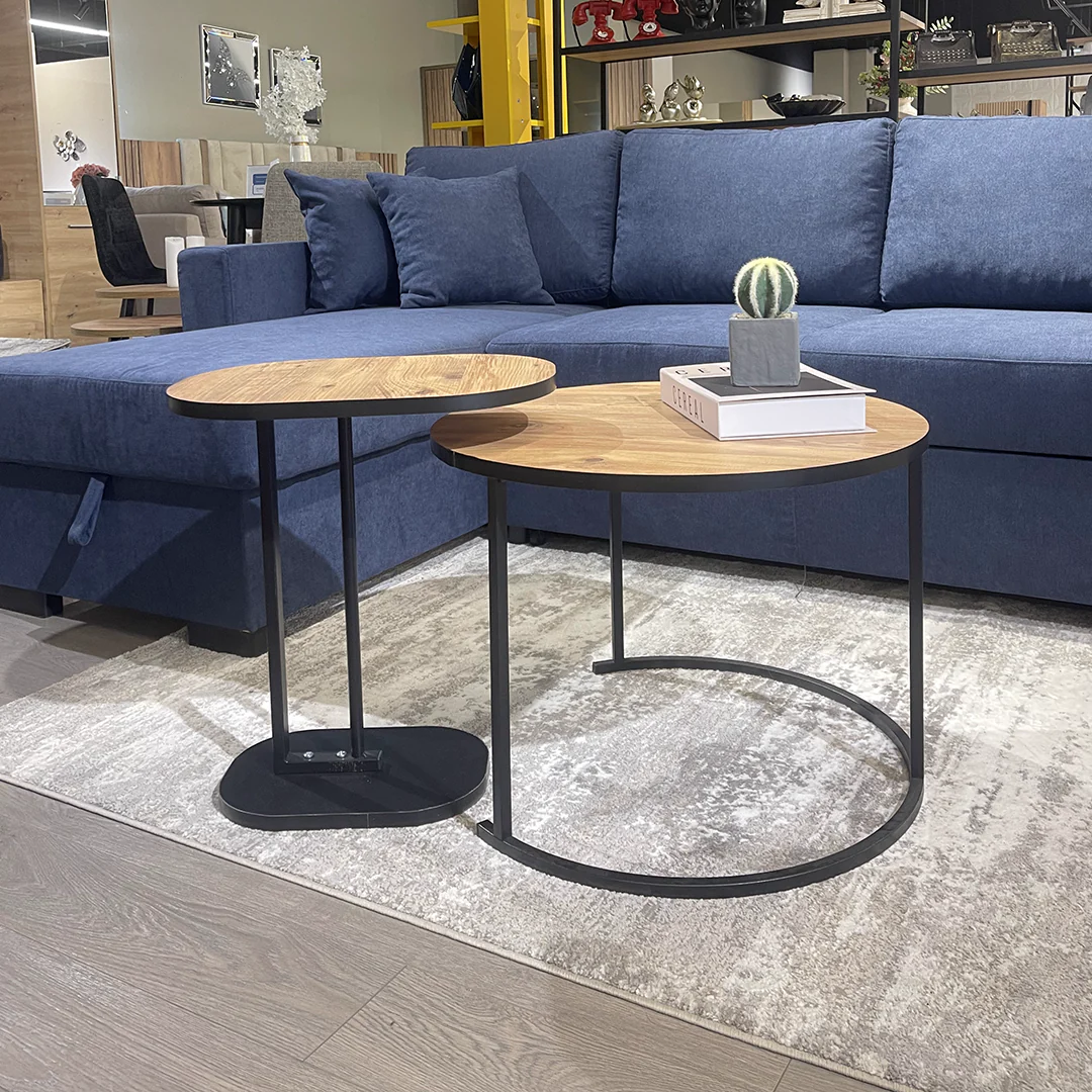 Set tavolinash mesi me dizajn bashkëkohor, që kombinon sipërfaqen me efekt druri natyral me strukturë metalike në ngjyrë të zezë. Format elegante dhe lartësitë e ndryshme ofrojnë fleksibilitet në përdorim dhe krijojnë një pamje dinamike në ambient. Zgjedhje ideale për sallone moderne që kërkojnë stil dhe funksionalitet.