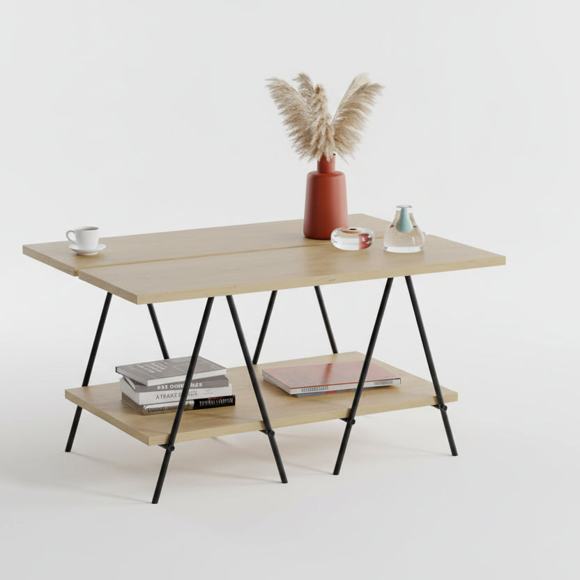 Tavolina e mesit Siel kombinon ngrohtësinë e ngjyrës Saphire Oak me strukturën elegante metalike në të zezë, duke krijuar një pamje moderne dhe funksionale për çdo ambient ndenjeje. Dizajni me dy nivele ofron hapësirë të mjaftueshme për dekor, libra apo aksesorë të përditshëm, ndërsa këmbët metalike sigurojnë stabilitet dhe stil minimalist.