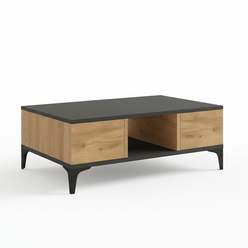 Tavolinë mesi me dizajn bashkëkohor, e kombinuar me sipërfaqe në ngjyrë të errët dhe strukturë në efekt druri natyral. Rafte të hapura ofrojnë hapësirë praktike për libra, revista apo aksesorë dekorativë.